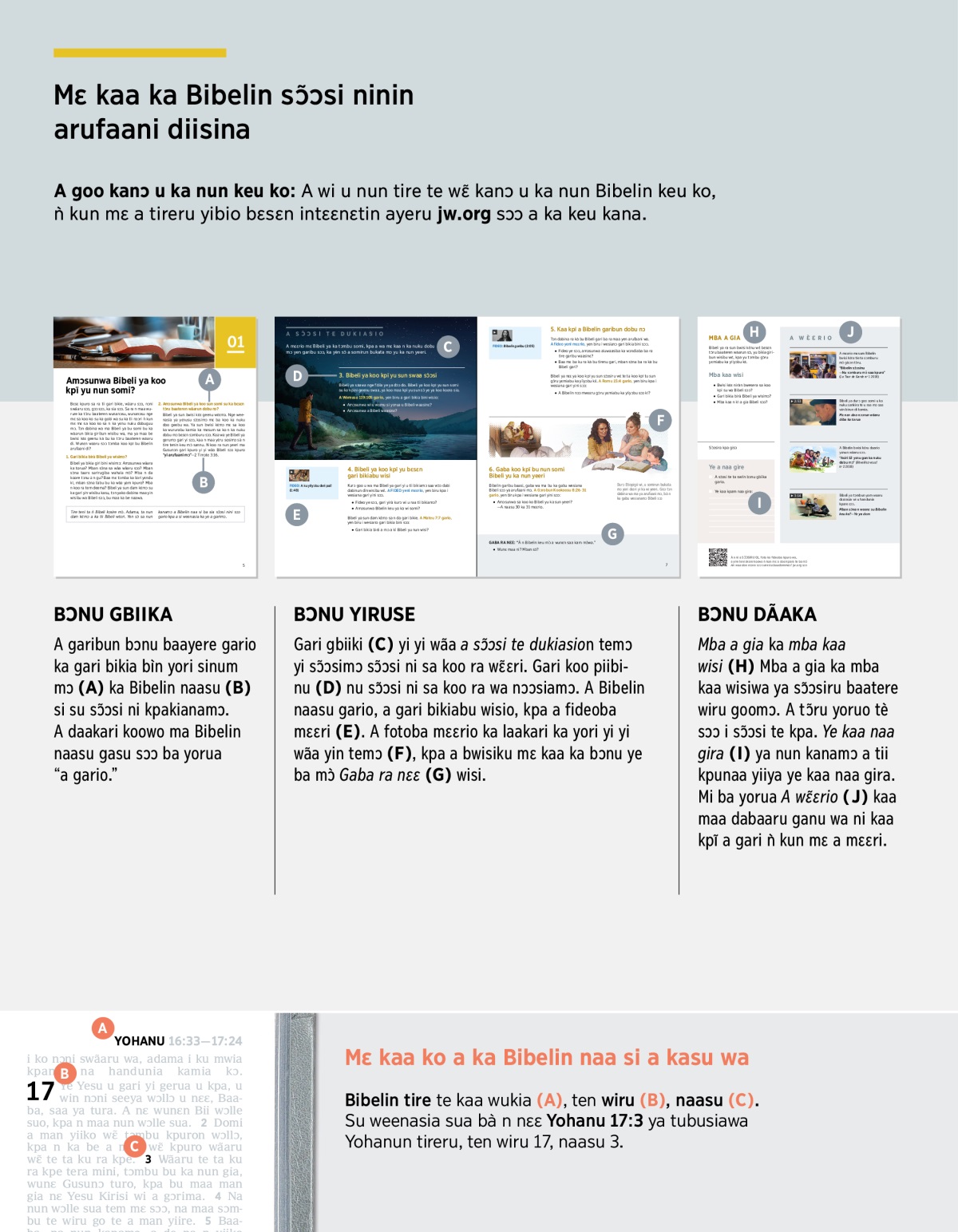 A goo kanɔ u ka nun keu ko: A wi u nun tire te wɛ̃ kanɔ u ka nun Bibelin keu ko, ǹ kun mɛ a tireru yibio bɛsɛn intɛɛnɛtin ayeru jw.org sɔɔ a ka keu kana.