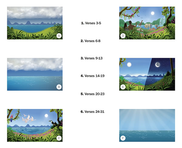 Read Genesis 1:1-31. Draw a line connecting each picture to the matching Bible verses. (The pictures are not in the correct order.)