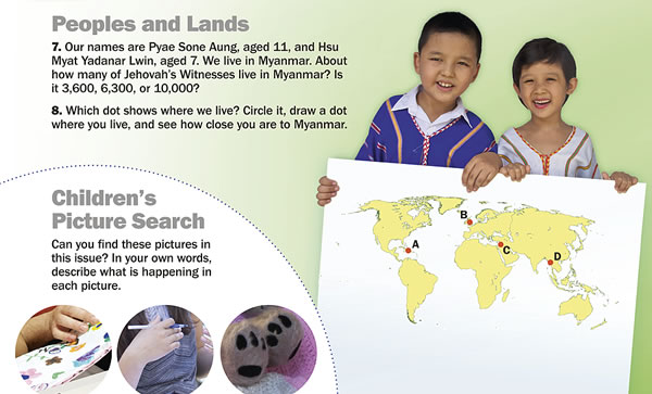 Our names are Pyae Sone Aung, aged 11, and Hsu Myat Yadanar Lwin, aged 7. We live in Myanmar. About how many of Jehovah’s Witnesses live in Myanmar? Is it 3,600, 6,300, or 10,000?