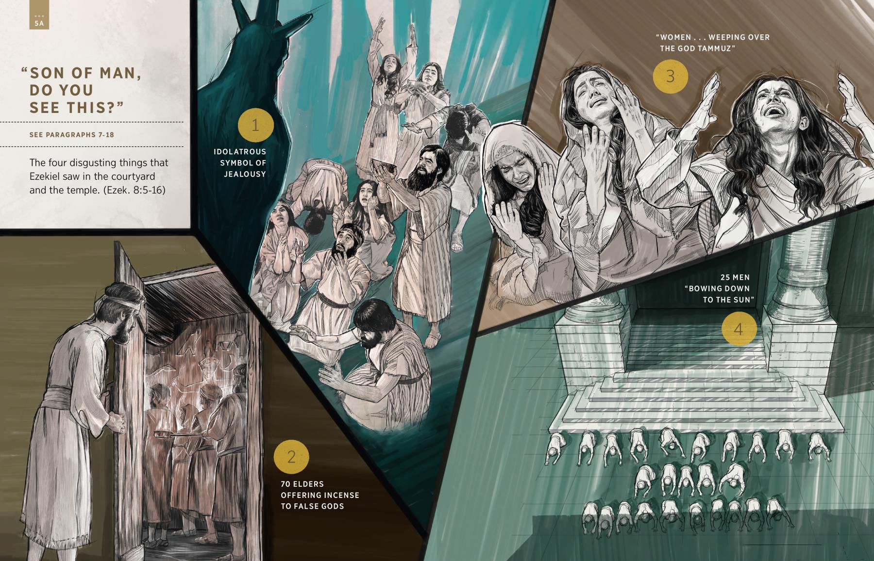 The four disgusting things that Ezekiel saw in the courtyard and the temple. (Ezek. 8:5-16)