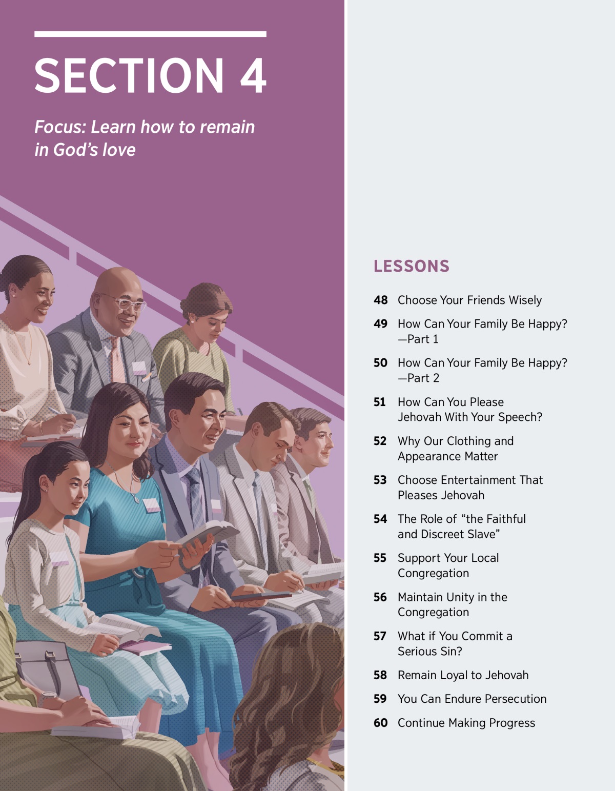 Section 4 Printed Edition Focus: Learn how to remain in God’s love LESSONS 48 Choose Your Friends Wisely 49 How Can Your Family Be Happy?—Part 1 50 How Can Your Family Be Happy?—Part 2 51 How Can You Please Jehovah With Your Speech? 52 Why Our Clothing and Appearance Matter 53 Choose Entertainment That Pleases Jehovah 54 The Role of “the Faithful and Discreet Slave” 55 Support Your Local Congregation 56 Maintain Unity in the Congregation 57 What if You Commit a Serious Sin? 58 Remain Loyal to Jehovah 59 You Can Endure Persecution 60 Continue Making Progress