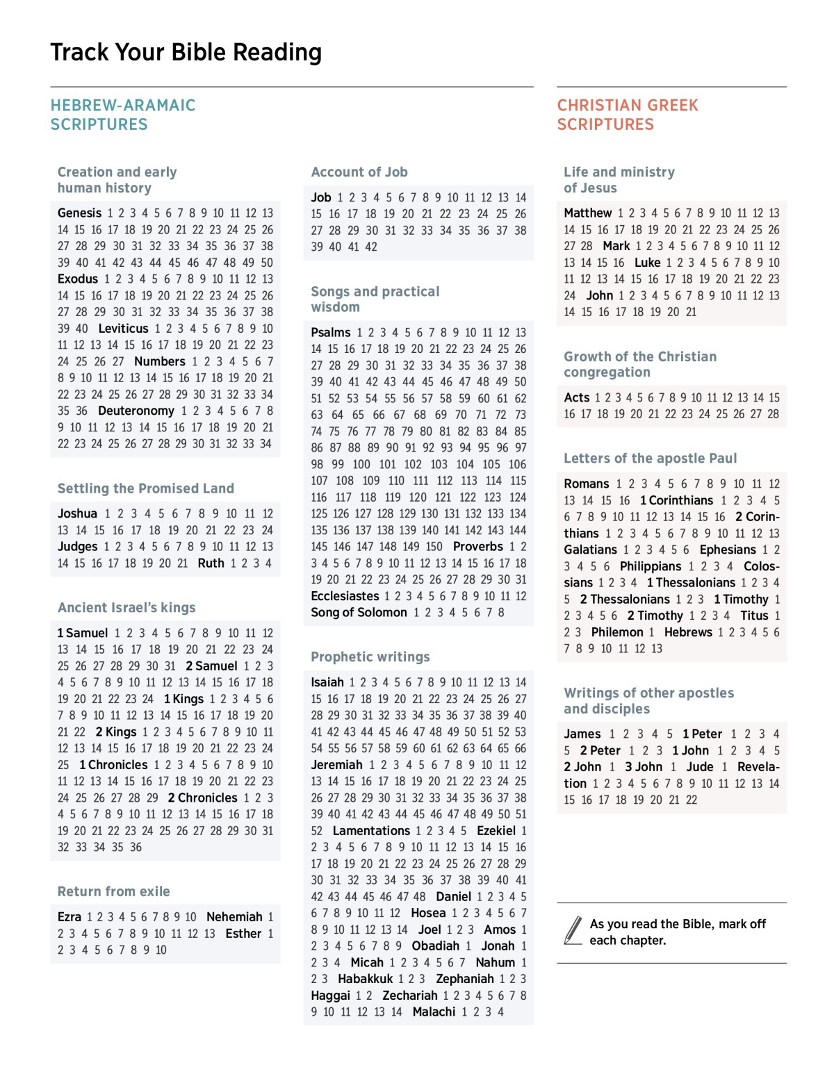 Track Your Bible Reading Printed Edition Creation and early human history Settling the Promised Land Ancient Israel’s kings Return from exile Account of Job Songs and practical wisdom Prophetic writings Life and ministry of Jesus Growth of the Christian congregation Letters of the apostle Paul Writings of other apostles and disciples As you read the Bible, mark off each chapter. HEBREW-ARAMAIC SCRIPTURES Creation and early human history Genesis 1 2 3 4 5 6 7 8 9 10 11 12 13 14 15 16 17 18 19 20 21 22 23 24 25 26 27 28 29 30 31 32 33 34 35 36 37 38 39 40 41 42 43 44 45 46 47 48 49 50 Exodus 1 2 3 4 5 6 7 8 9 10 11 12 13 14 15 16 17 18 19 20 21 22 23 24 25 26 27 28 29 30 31 32 33 34 35 36 37 38 39 40 Leviticus 1 2 3 4 5 6 7 8 9 10 11 12 13 14 15 16 17 18 19 20 21 22 23 24 25 26 27 Numbers 1 2 3 4 5 6 7 8 9 10 11 12 13 14 15 16 17 18 19 20 21 22 23 24 25 26 27 28 29 30 31 32 33 34 35 36 Deuteronomy 1 2 3 4 5 6 7 8 9 10 11 12 13 14 15 16 17 18 19 20 21 22 23 24 25 26 27 28 29 30 31 32 33 34 Settling the Promised Land Joshua 1 2 3 4 5 6 7 8 9 10 11 12 13 14 15 16 17 18 19 20 21 22 23 24 Judges 1 2 3 4 5 6 7 8 9 10 11 12 13 14 15 16 17 18 19 20 21 Ruth 1 2 3 4 Ancient Israel’s kings 1 Samuel 1 2 3 4 5 6 7 8 9 10 11 12 13 14 15 16 17 18 19 20 21 22 23 24 25 26 27 28 29 30 31 2 Samuel 1 2 3 4 5 6 7 8 9 10 11 12 13 14 15 16 17 18 19 20 21 22 23 24 1 Kings 1 2 3 4 5 6 7 8 9 10 11 12 13 14 15 16 17 18 19 20 21 22 2 Kings 1 2 3 4 5 6 7 8 9 10 11 12 13 14 15 16 17 18 19 20 21 22 23 24 25 1 Chronicles 1 2 3 4 5 6 7 8 9 10 11 12 13 14 15 16 17 18 19 20 21 22 23 24 25 26 27 28 29 2 Chronicles 1 2 3 4 5 6 7 8 9 10 11 12 13 14 15 16 17 18 19 20 21 22 23 24 25 26 27 28 29 30 31 32 33 34 35 36 Return from exile Ezra 1 2 3 4 5 6 7 8 9 10 Nehemiah 1 2 3 4 5 6 7 8 9 10 11 12 13 Esther 1 2 3 4 5 6 7 8 9 10 Account of Job Job 1 2 3 4 5 6 7 8 9 10 11 12 13 14 15 16 17 18 19 20 21 22 23 24 25 26 27 28 29 30 31 32 33 34 35 36 37 38 39 40 41 42 Songs and practical wisdom Psalms 1 2 3 4 5 6 7 8 9 10 11 12 13 14 15 16 17 18 19 20 21 22 23 24 25 26 27 28 29 30 31 32 33 34 35 36 37 38 39 40 41 42 43 44 45 46 47 48 49 50 51 52 53 54 55 56 57 58 59 60 61 62 63 64 65 66 67 68 69 70 71 72 73 74 75 76 77 78 79 80 81 82 83 84 85 86 87 88 89 90 91 92 93 94 95 96 97 98 99 100 101 102 103 104 105 106 107 108 109 110 111 112 113 114 115 116 117 118 119 120 121 122 123 124 125 126 127 128 129 130 131 132 133 134 135 136 137 138 139 140 141 142 143 144 145 146 147 148 149 150 Proverbs 1 2 3 4 5 6 7 8 9 10 11 12 13 14 15 16 17 18 19 20 21 22 23 24 25 26 27 28 29 30 31 Ecclesiastes 1 2 3 4 5 6 7 8 9 10 11 12 Song of Solomon 1 2 3 4 5 6 7 8 Prophetic writings Isaiah 1 2 3 4 5 6 7 8 9 10 11 12 13 14 15 16 17 18 19 20 21 22 23 24 25 26 27 28 29 30 31 32 33 34 35 36 37 38 39 40 41 42 43 44 45 46 47 48 49 50 51 52 53 54 55 56 57 58 59 60 61 62 63 64 65 66 Jeremiah 1 2 3 4 5 6 7 8 9 10 11 12 13 14 15 16 17 18 19 20 21 22 23 24 25 26 27 28 29 30 31 32 33 34 35 36 37 38 39 40 41 42 43 44 45 46 47 48 49 50 51 52 Lamentations 1 2 3 4 5 Ezekiel 1 2 3 4 5 6 7 8 9 10 11 12 13 14 15 16 17 18 19 20 21 22 23 24 25 26 27 28 29 30 31 32 33 34 35 36 37 38 39 40 41 42 43 44 45 46 47 48 Daniel 1 2 3 4 5 6 7 8 9 10 11 12 Hosea 1 2 3 4 5 6 7 8 9 10 11 12 13 14 Joel 1 2 3 Amos 1 2 3 4 5 6 7 8 9 Obadiah 1 Jonah 1 2 3 4 Micah 1 2 3 4 5 6 7 Nahum 1 2 3 Habakkuk 1 2 3 Zephaniah 1 2 3 Haggai 1 2 Zechariah 1 2 3 4 5 6 7 8 9 10 11 12 13 14 Malachi 1 2 3 4 CHRISTIAN GREEK SCRIPTURES Life and ministry of Jesus Matthew 1 2 3 4 5 6 7 8 9 10 11 12 13 14 15 16 17 18 19 20 21 22 23 24 25 26 27 28 Mark 1 2 3 4 5 6 7 8 9 10 11 12 13 14 15 16 Luke 1 2 3 4 5 6 7 8 9 10 11 12 13 14 15 16 17 18 19 20 21 22 23 24 John 1 2 3 4 5 6 7 8 9 10 11 12 13 14 15 16 17 18 19 20 21 Growth of the Christian congregation Acts 1 2 3 4 5 6 7 8 9 10 11 12 13 14 15 16 17 18 19 20 21 22 23 24 25 26 27 28 Letters of the apostle Paul Romans 1 2 3 4 5 6 7 8 9 10 11 12 13 14 15 16 1 Corinthians 1 2 3 4 5 6 7 8 9 10 11 12 13 14 15 16 2 Corinthians 1 2 3 4 5 6 7 8 9 10 11 12 13 Galatians 1 2 3 4 5 6 Ephesians 1 2 3 4 5 6 Philippians 1 2 3 4 Colossians 1 2 3 4 1 Thessalonians 1 2 3 4 5 2 Thessalonians 1 2 3 1 Timothy 1 2 3 4 5 6 2 Timothy 1 2 3 4 Titus 1 2 3 Philemon 1 Hebrews 1 2 3 4 5 6 7 8 9 10 11 12 13 Writings of other apostles and disciples James 1 2 3 4 5 1 Peter 1 2 3 4 5 2 Peter 1 2 3 1 John 1 2 3 4 5 2 John 1 3 John 1 Jude 1 Revelation 1 2 3 4 5 6 7 8 9 10 11 12 13 14 15 16 17 18 19 20 21 22