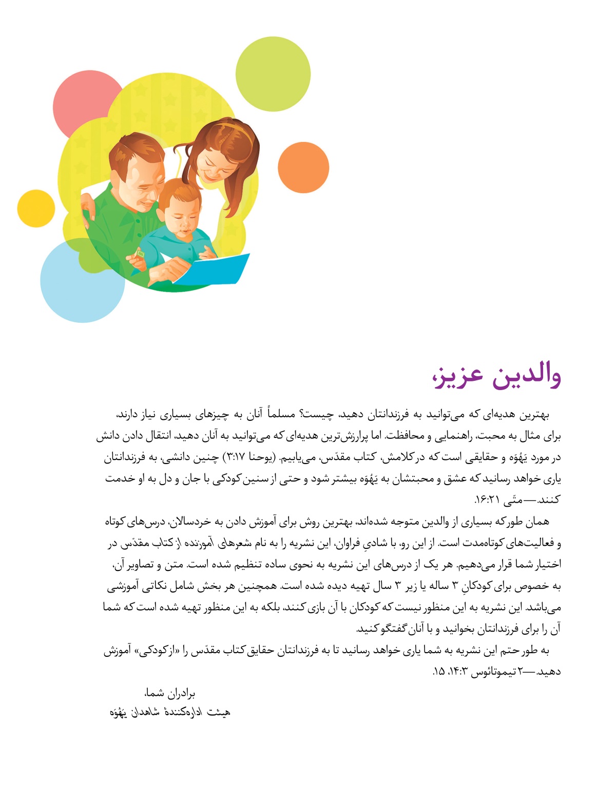 همان طور که بسیاری از والدین متوجه شدهاند، بهترین روش برای آموزش دادن به خردسالان، درسهای کوتاه و فعالیتهای کوتاهمدت است. از این رو، با شادیِ فراوان، این نشریه را به نام شعرهای آموزنده از کتاب مقدّس در اختیار شما قرار میدهیم. هر یک از درسهای این نشریه به نحوی ساده تنظیم شده است. متن و تصاویر آن، به خصوص برای کودکانِ ۳ ساله یا زیر ۳ سال تهیه دیده شده است. همچنین هر بخش شامل نکاتی آموزشی میباشد. این نشریه به این منظور نیست که کودکان با آن بازی کنند، بلکه به این منظور تهیه شده است که شما آن را برای فرزندانتان بخوانید و با آنان گفتگو کنید.
