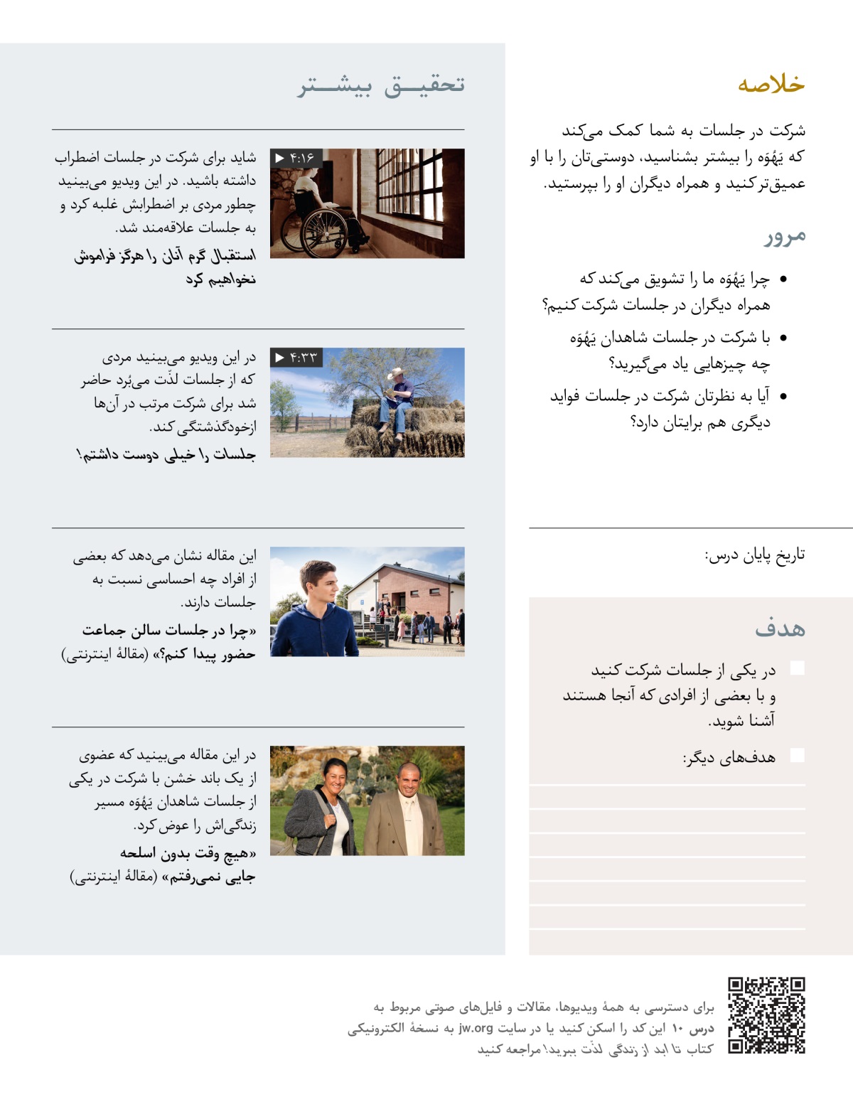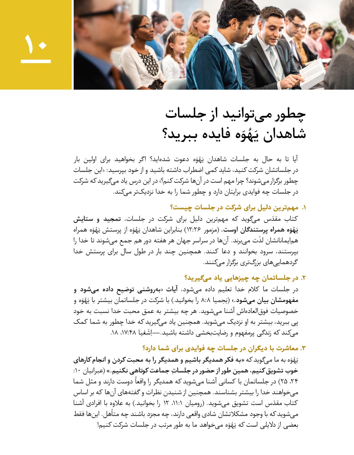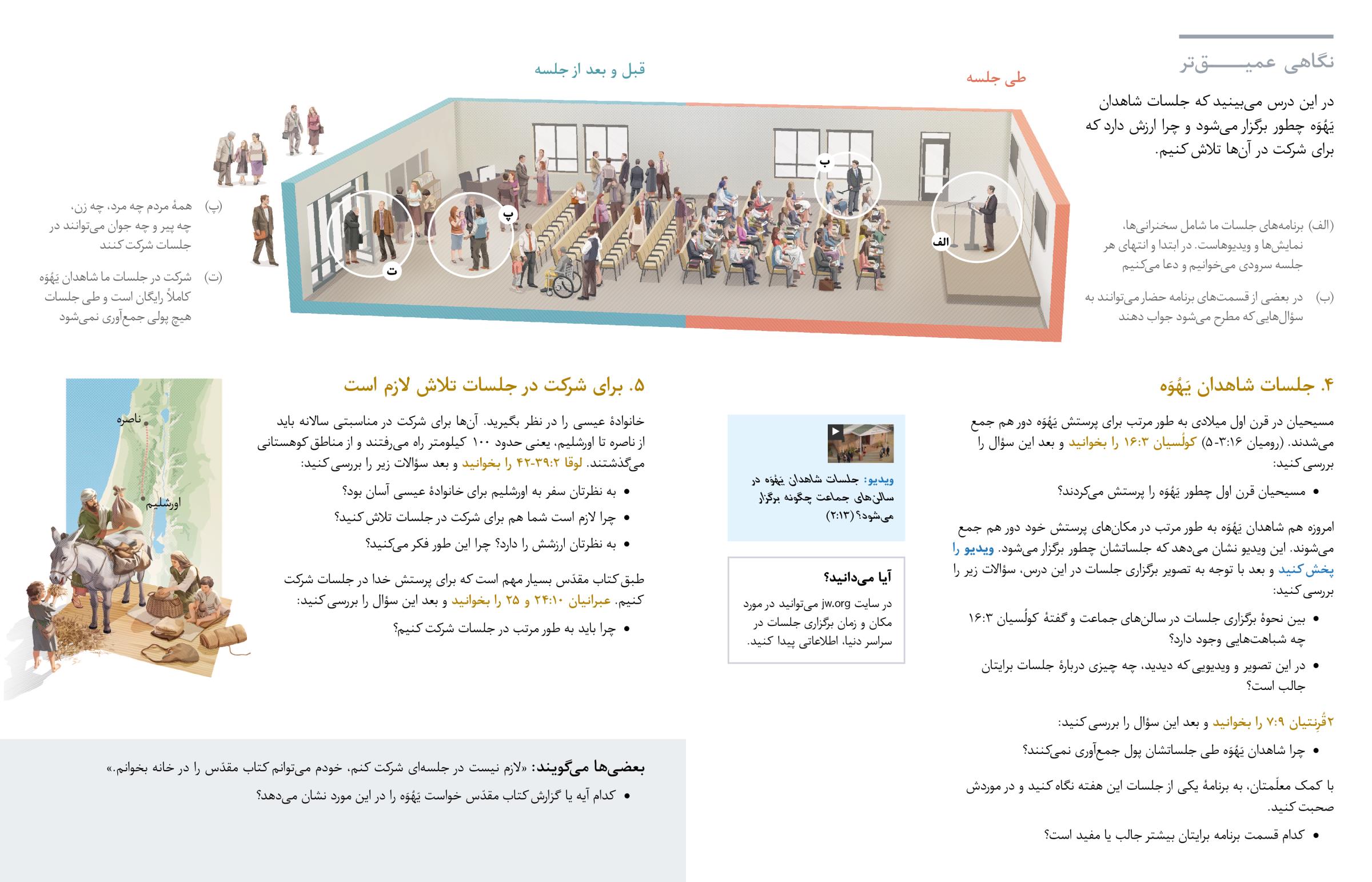 آیا تا به حال به جلسات شاهدان یَهُوَه دعوت شدهاید؟ اگر بخواهید برای اولین بار در جلساتشان شرکت کنید، شاید کمی اضطراب داشته باشید و از خود بپرسید: ‹این جلسات چطور برگزار میشوند؟ چرا مهم است در آنها شرکت کنم؟› در این درس یاد میگیرید که شرکت در جلسات چه فوایدی برایتان دارد و چطور شما را به خدا نزدیکتر میکند.