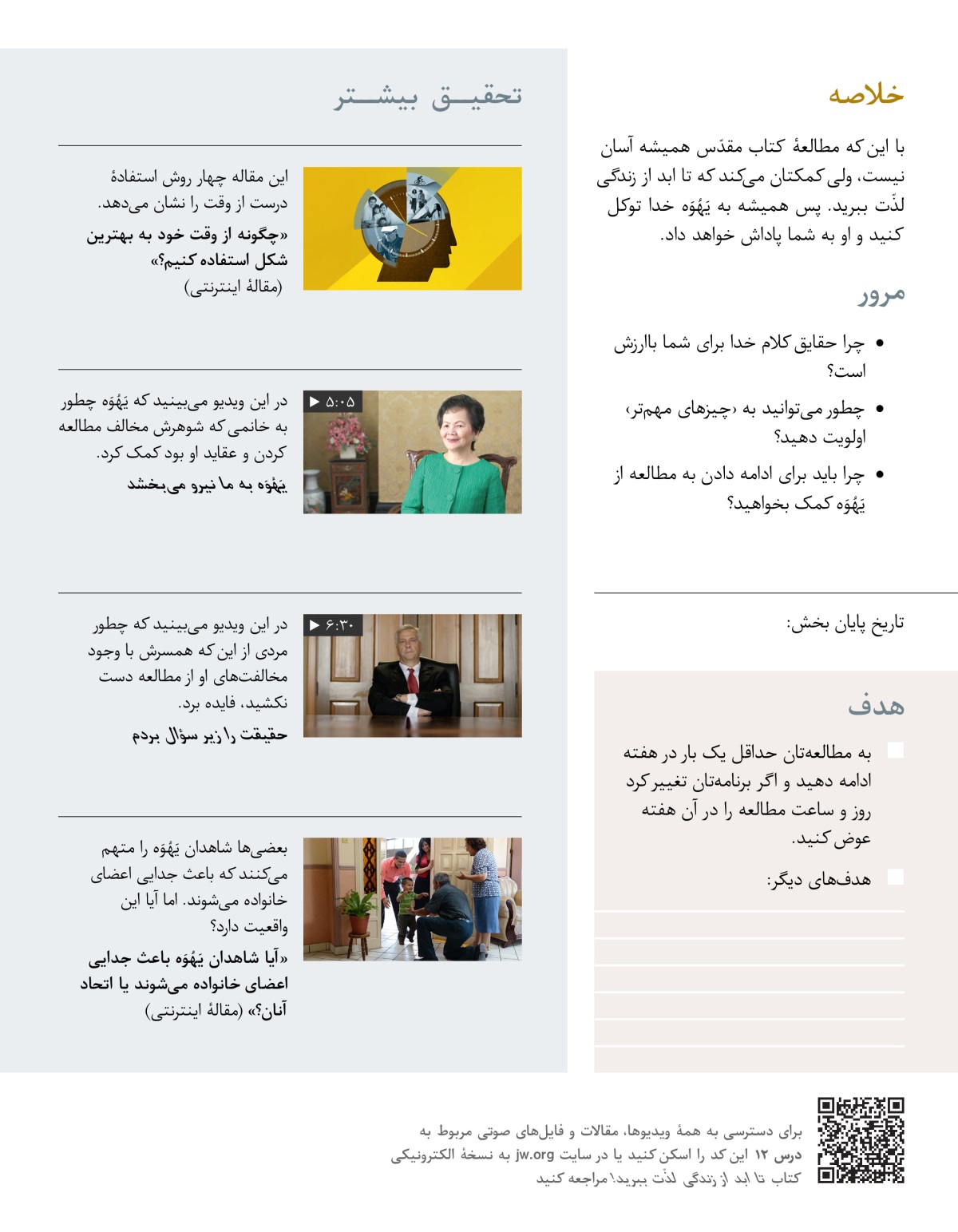 در این درس یاد میگیرید که چطور میتوانید با وجود مشغلههای زندگی و مخالفت دیگران به مطالعهٔ کتاب مقدّس ادامه دهید و میبینید که یَهُوَه چطور در این راه به شما کمک میکند.