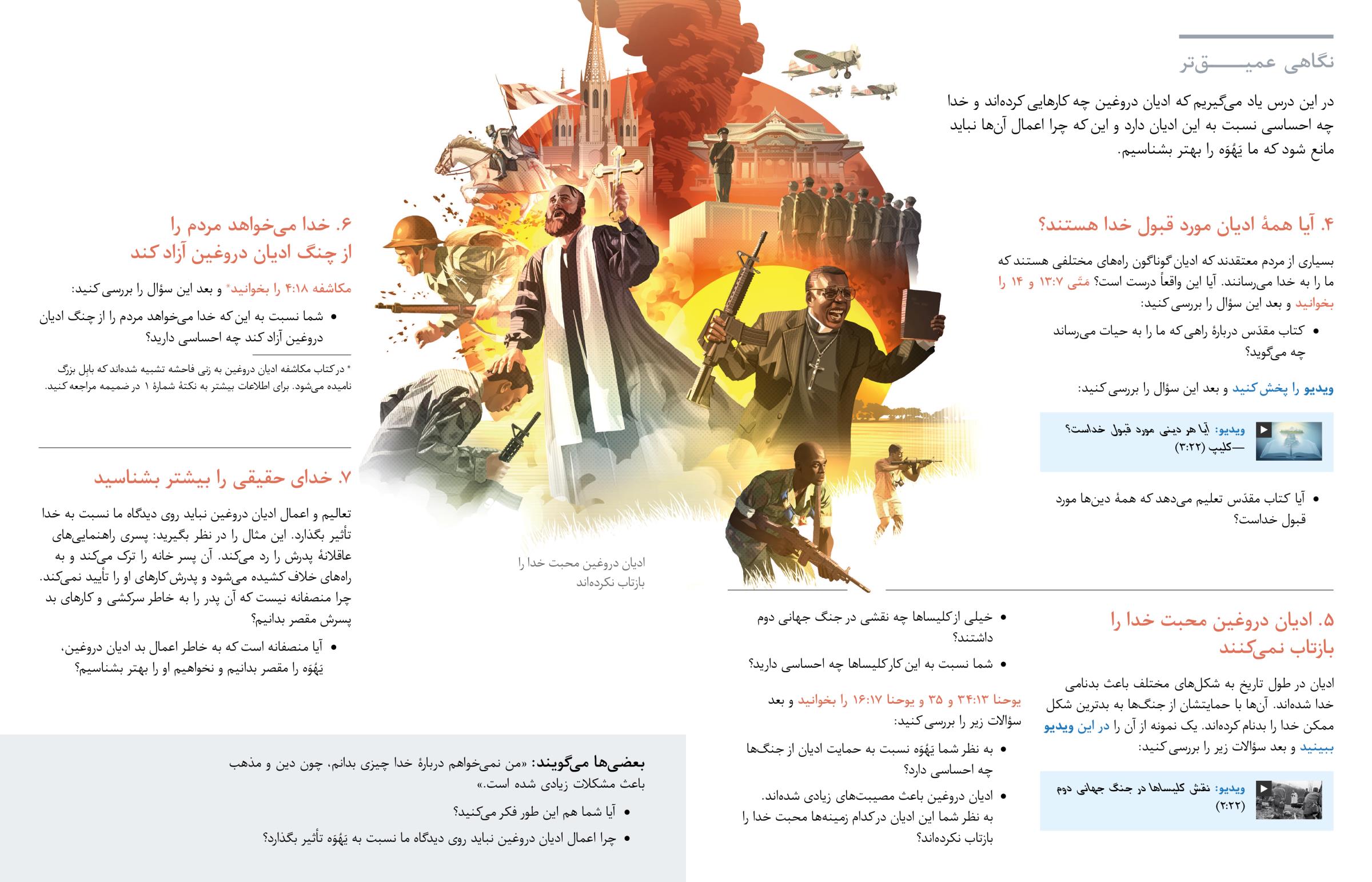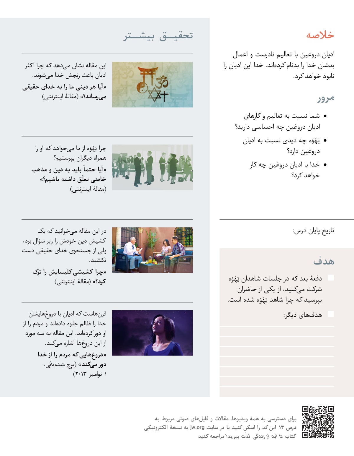 در این درس یاد میگیریم که ادیان دروغین چه کارهایی کردهاند و خدا چه احساسی نسبت به این ادیان دارد و این که چرا اعمال آنها نباید مانع شود که ما یَهُوَه را بهتر بشناسیم.