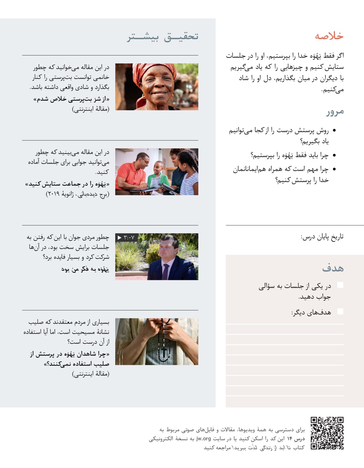 در این درس میبینیم که چرا یَهُوَه نمیخواهد در پرستشمان از هیچ بت یا شیئی استفاده کنیم و یاد میگیریم از چه راههایی میتوانیم خدا را ستایش کنیم.