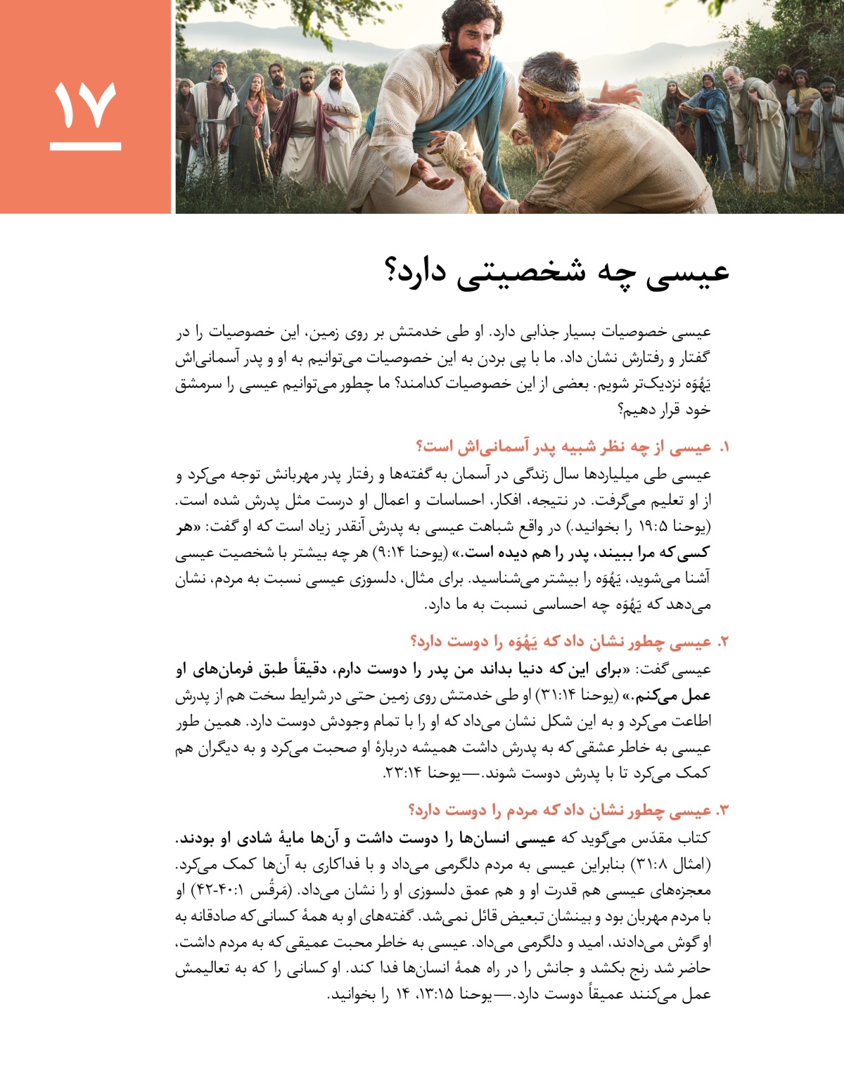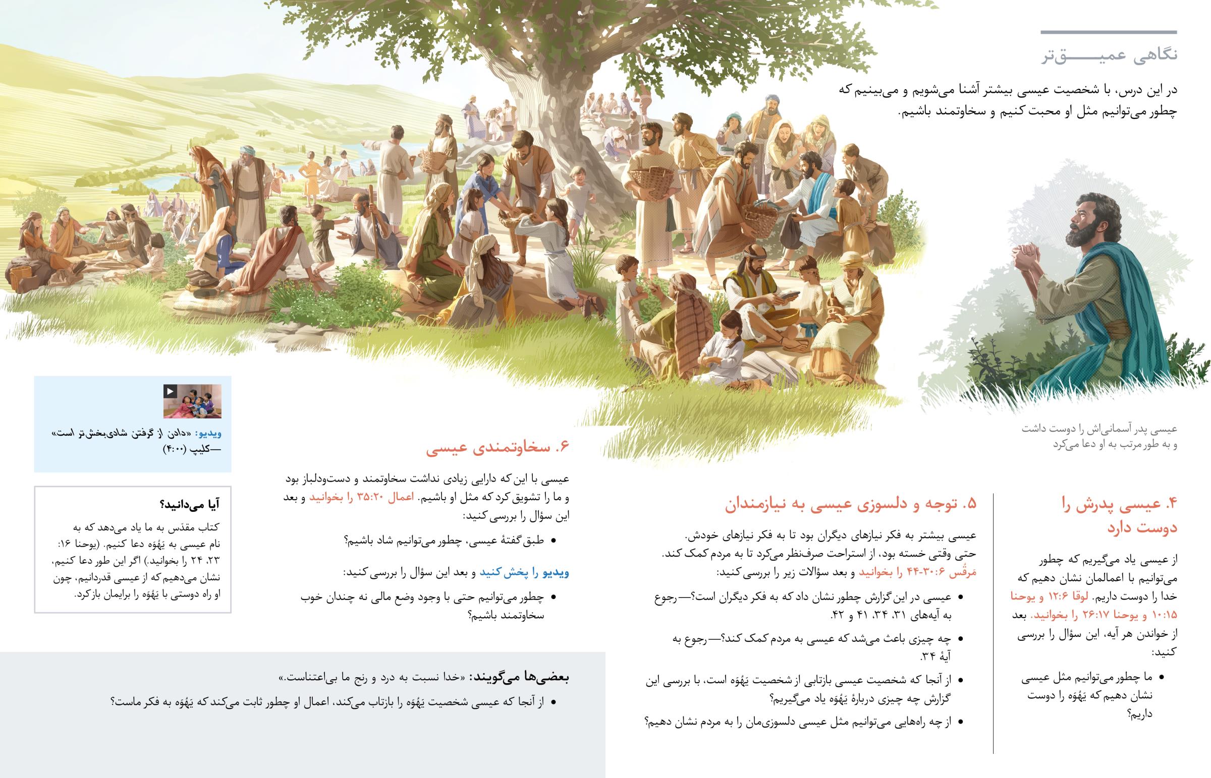 در این درس، با شخصیت عیسی بیشتر آشنا میشویم و میبینیم که چطور میتوانیم مثل او محبت کنیم و سخاوتمند باشیم.