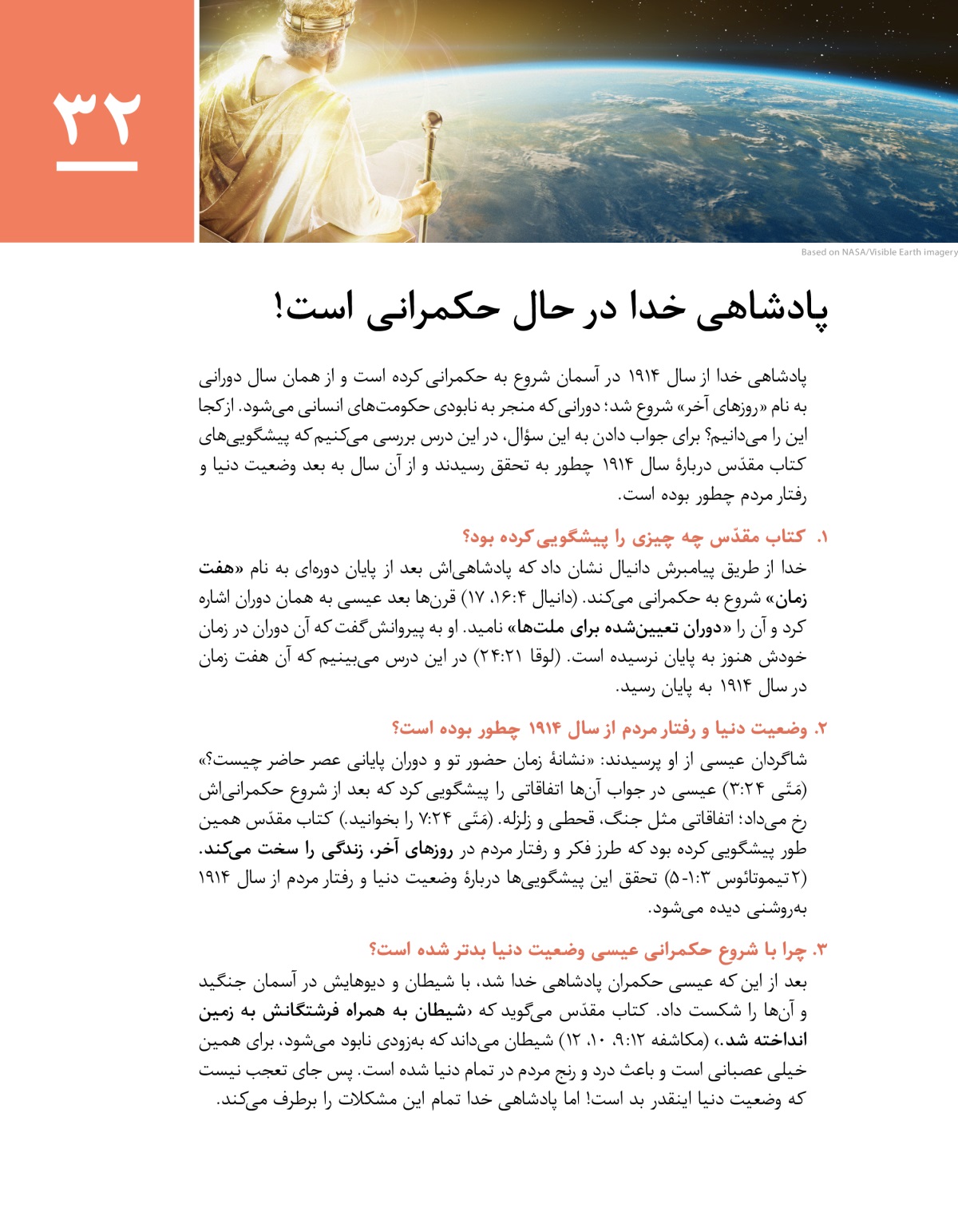 در این درس میبینیم که پادشاهی خدا از سال ۱۹۱۴ شروع به حکمرانی کرده است و این موضوع چه تأثیری بر زندگی ما میگذارد.