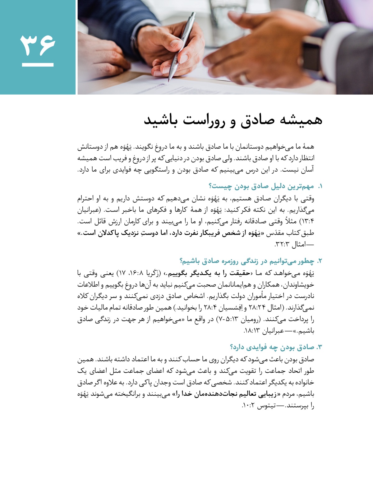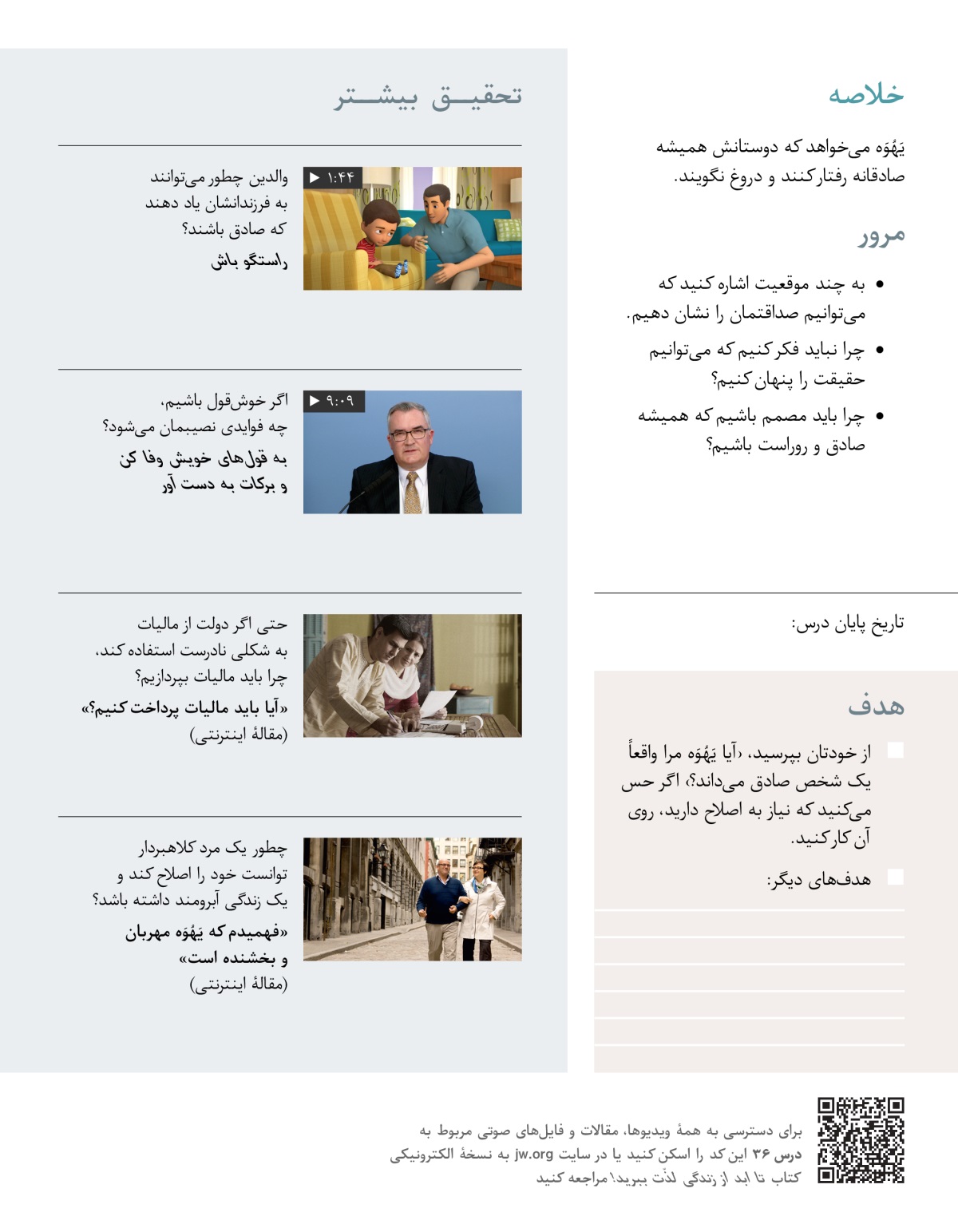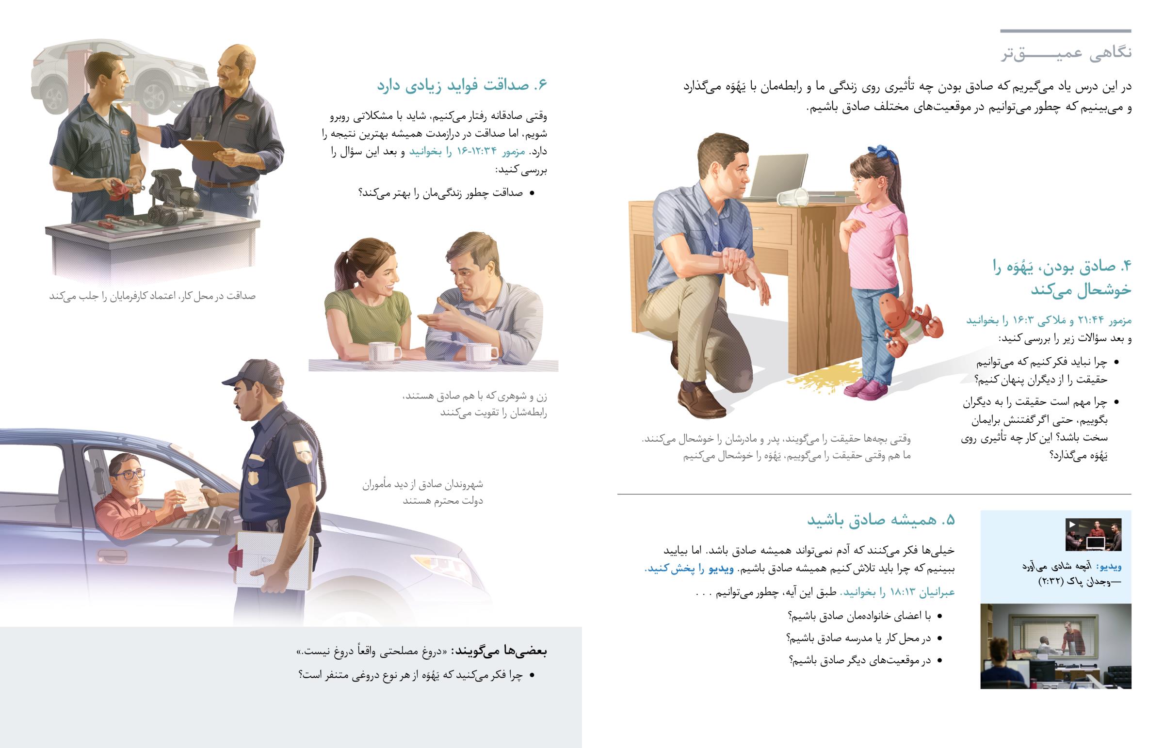 در این درس یاد میگیریم که صادق بودن چه تأثیری روی زندگی ما و رابطهمان با یَهُوَه میگذارد و میبینیم که چطور میتوانیم در موقعیتهای مختلف صادق باشیم.