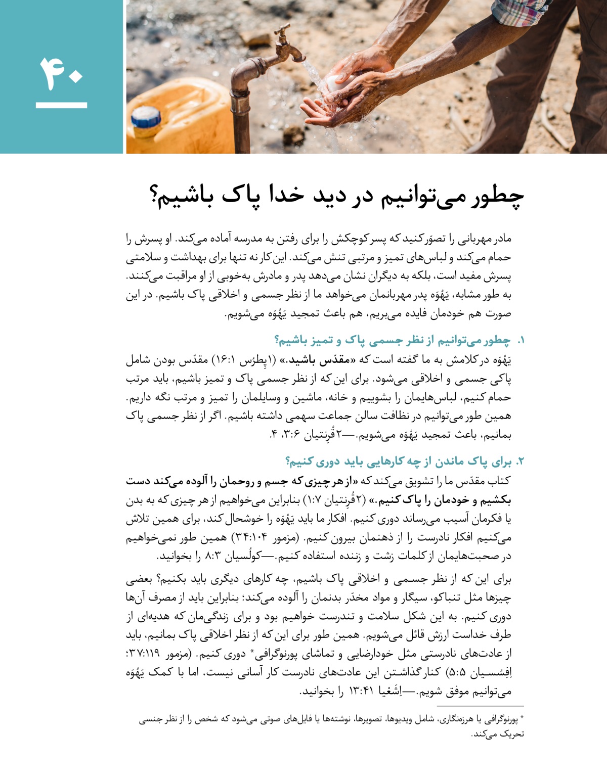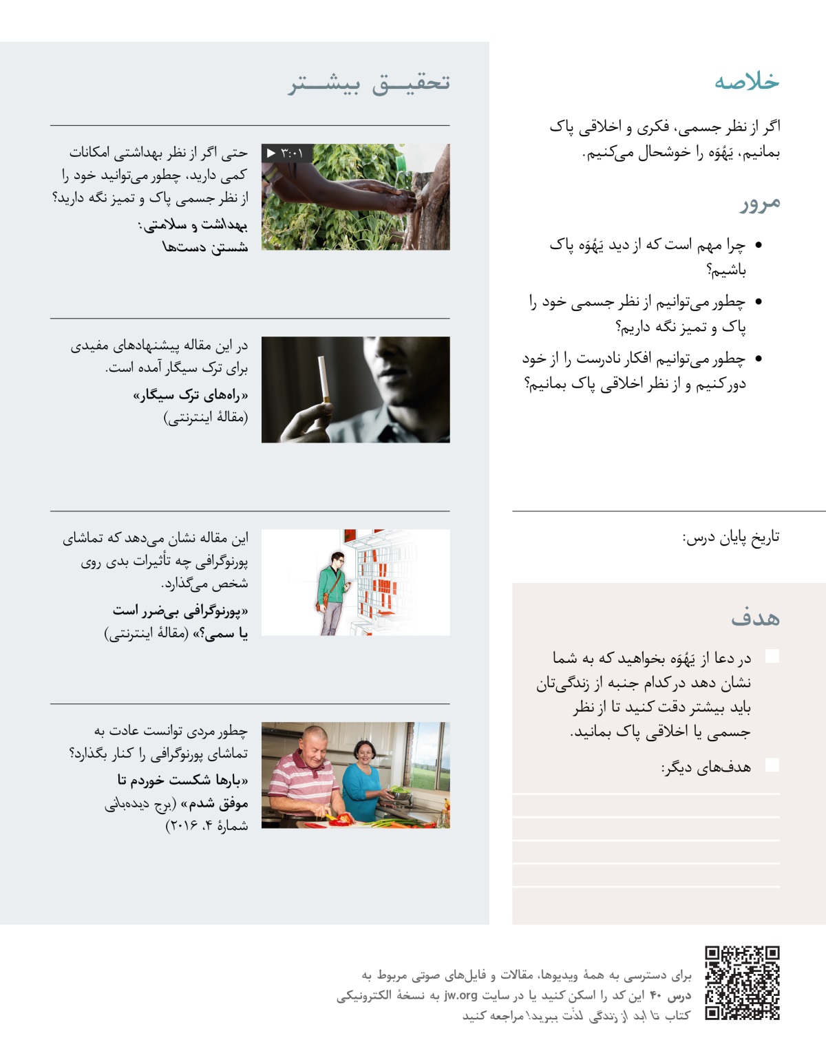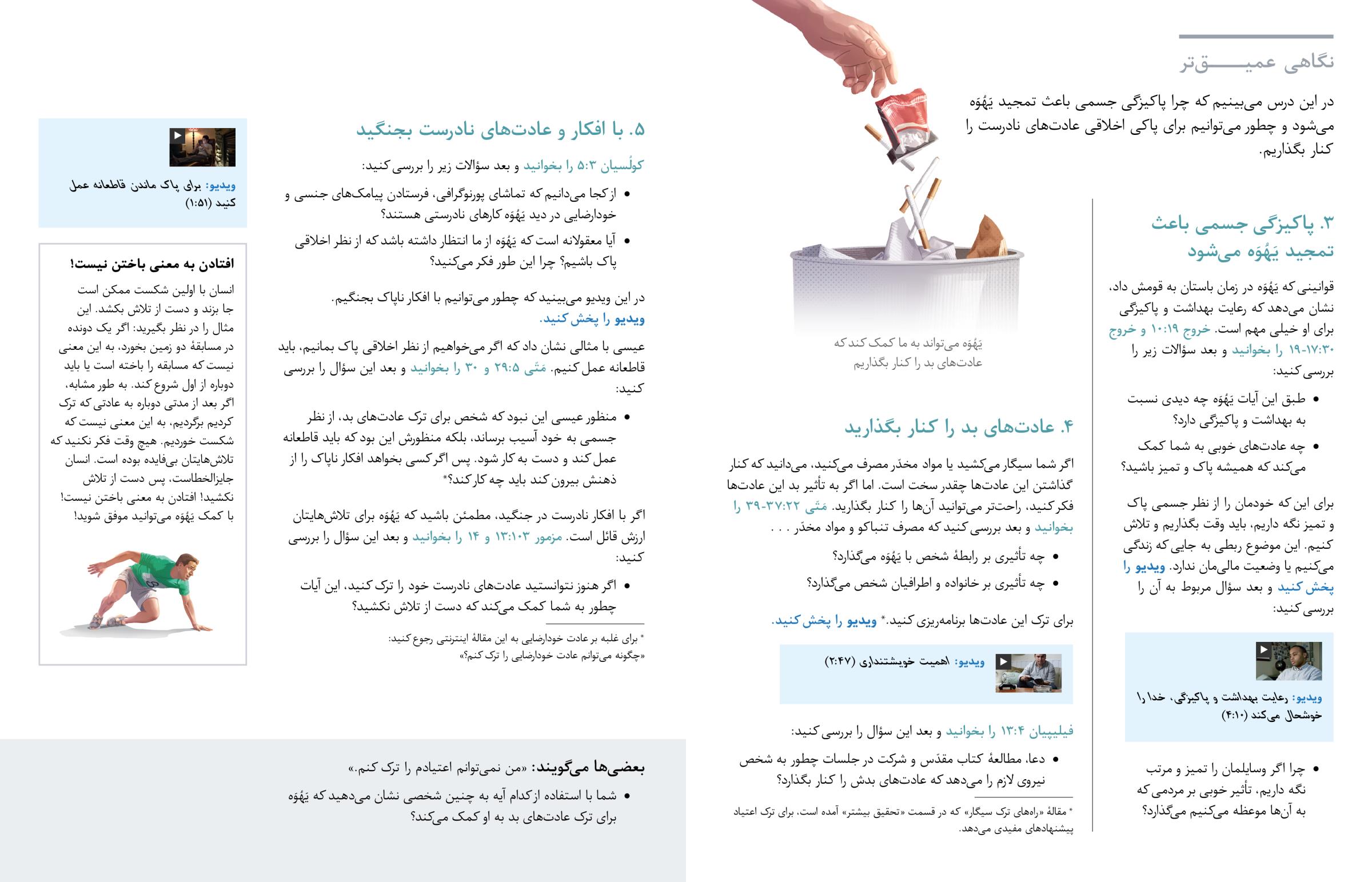 در این درس میبینیم که چرا پاکیزگی جسمی باعث تمجید یَهُوَه میشود و چطور میتوانیم برای پاکی اخلاقی عادتهای نادرست را کنار بگذاریم.