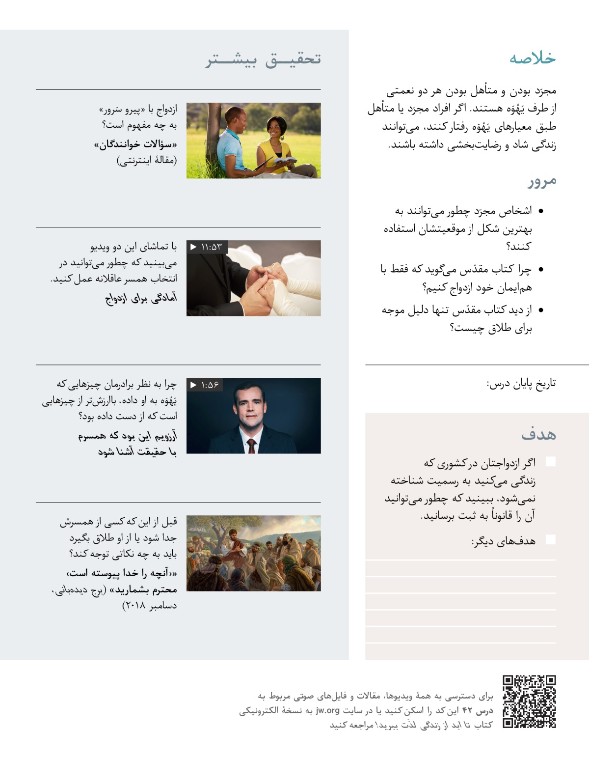 در این درس یاد میگیریم که افراد مجرّد و متأهل چطور میتوانند شاد باشند و یَهُوَه را خوشحال کنند.