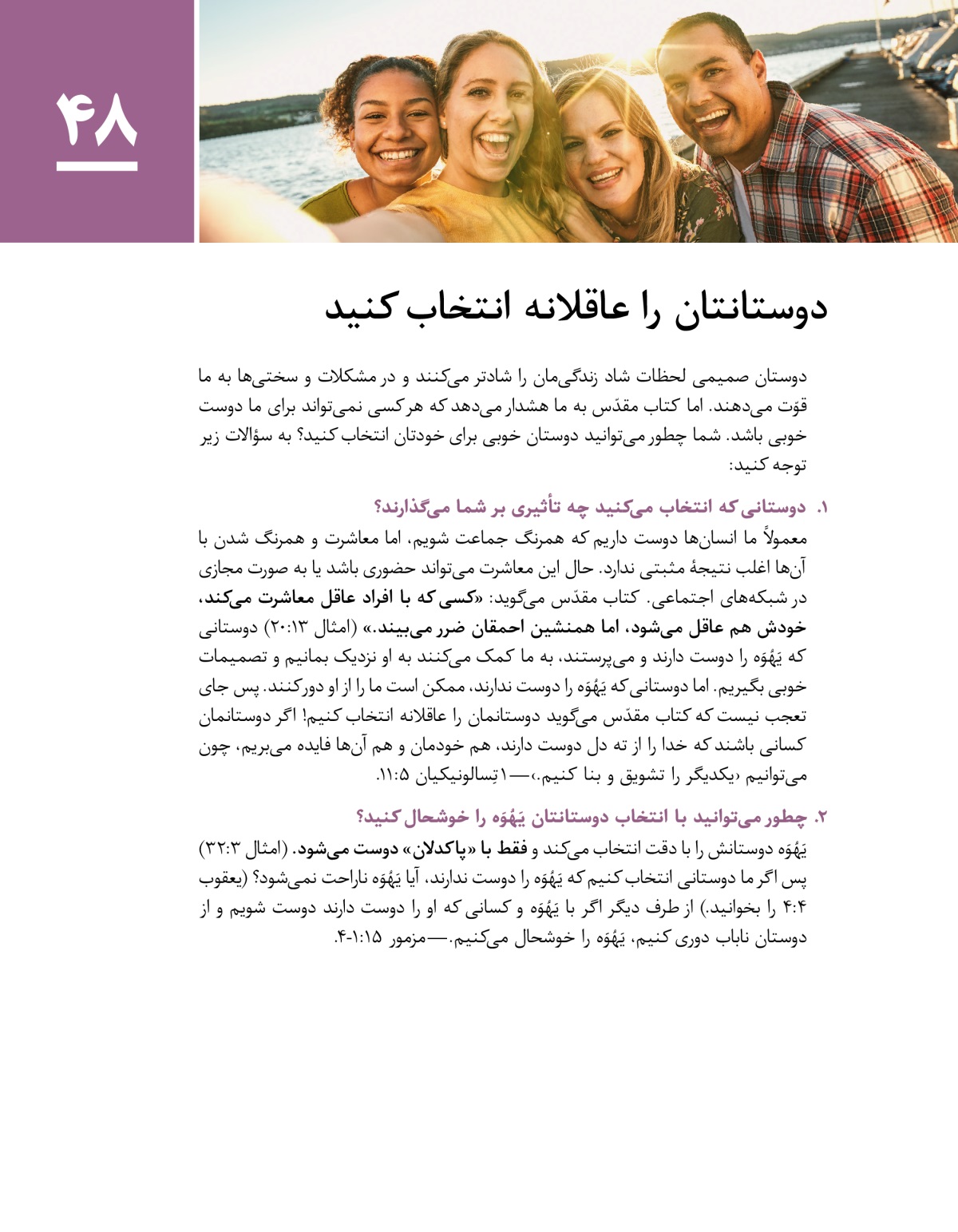 دوستان صمیمی لحظات شاد زندگیمان را شادتر میکنند و در مشکلات و سختیها به ما قوّت میدهند. اما کتاب مقدّس به ما هشدار میدهد که هر کسی نمیتواند برای ما دوست خوبی باشد. شما چطور میتوانید دوستان خوبی برای خودتان انتخاب کنید؟ به سؤالات زیر توجه کنید: