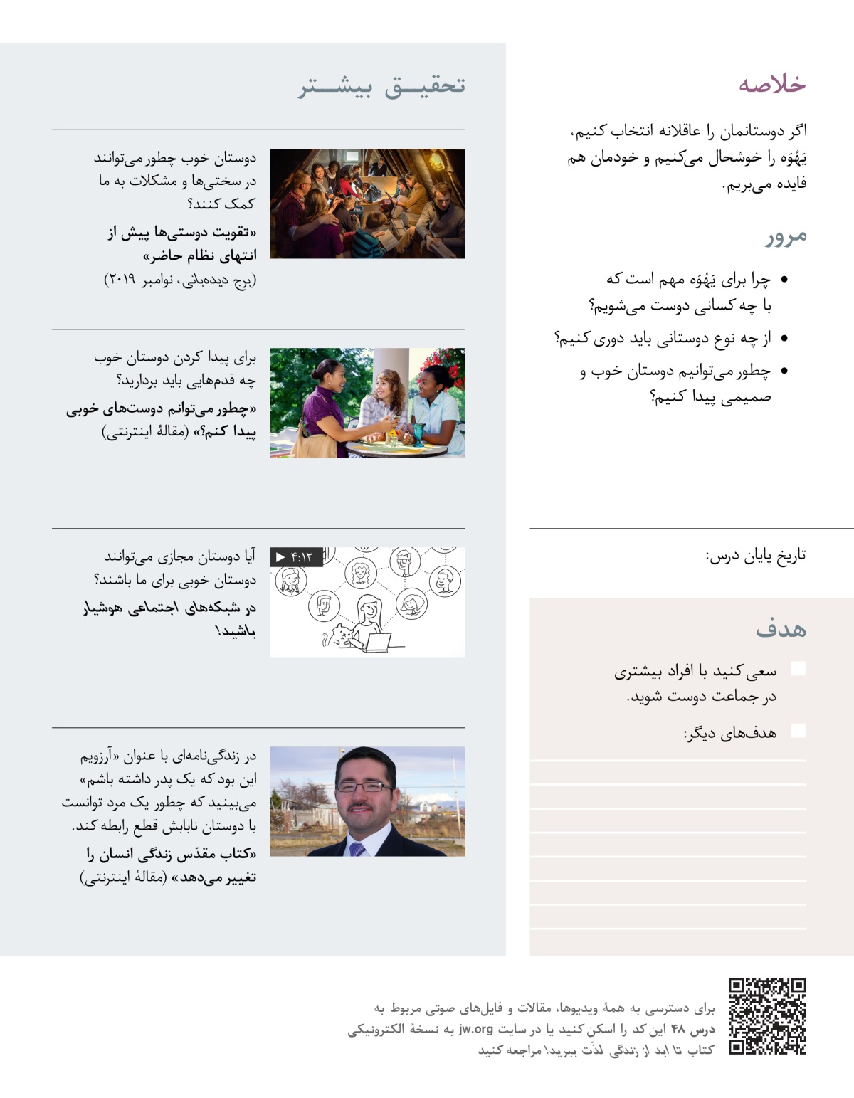 در این درس یاد میگیریم که چرا انتخاب دوستان خوب مهم است. همین طور میبینیم که چطور میتوانیم دوستانی پیدا کنیم که در کنارشان آرامش و رضایتخاطر داشته باشیم.