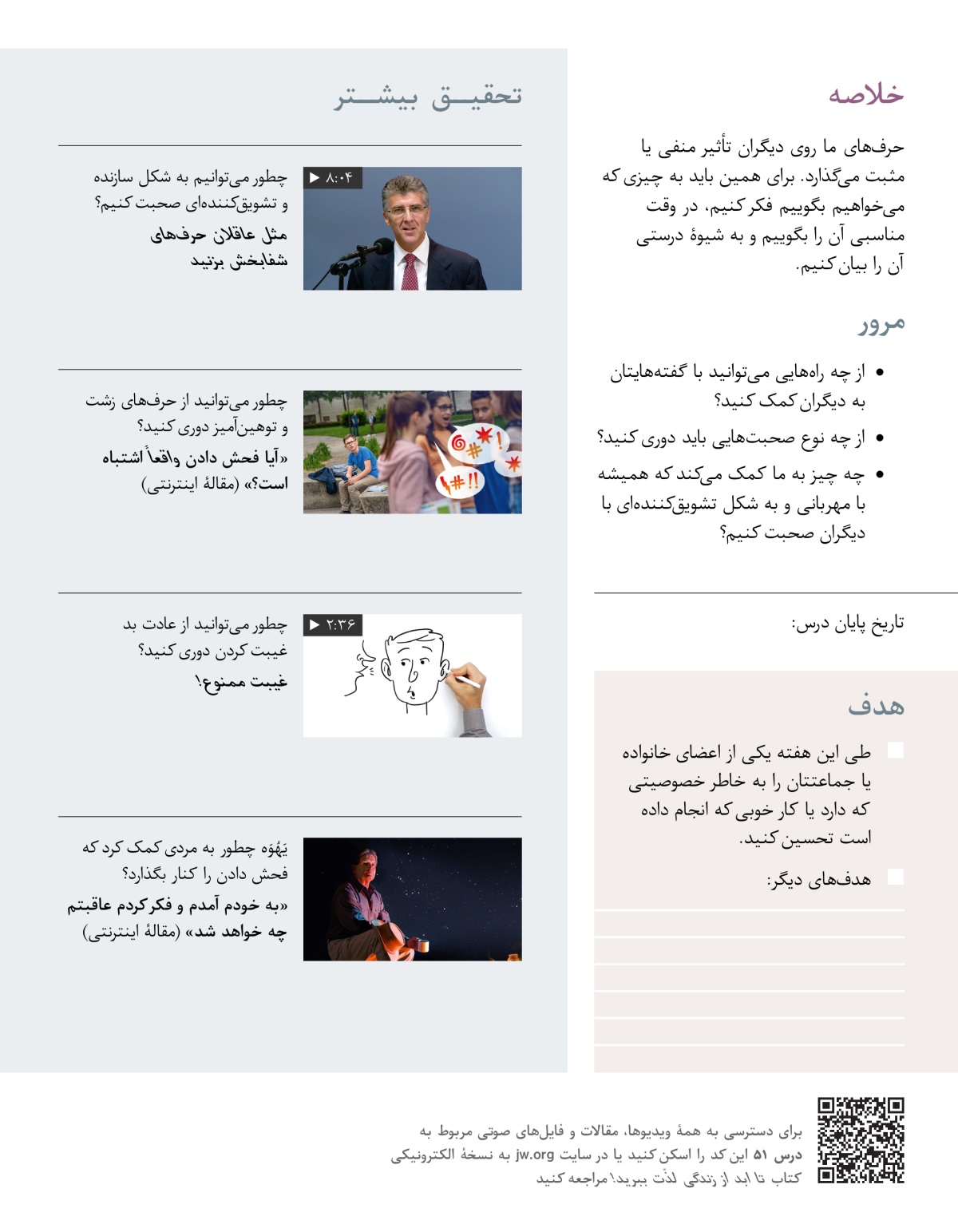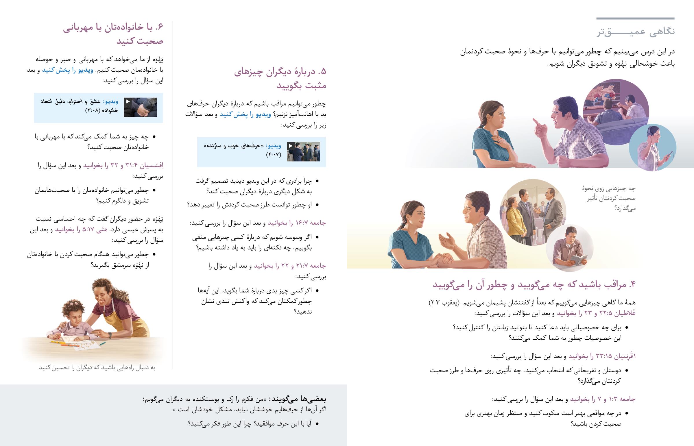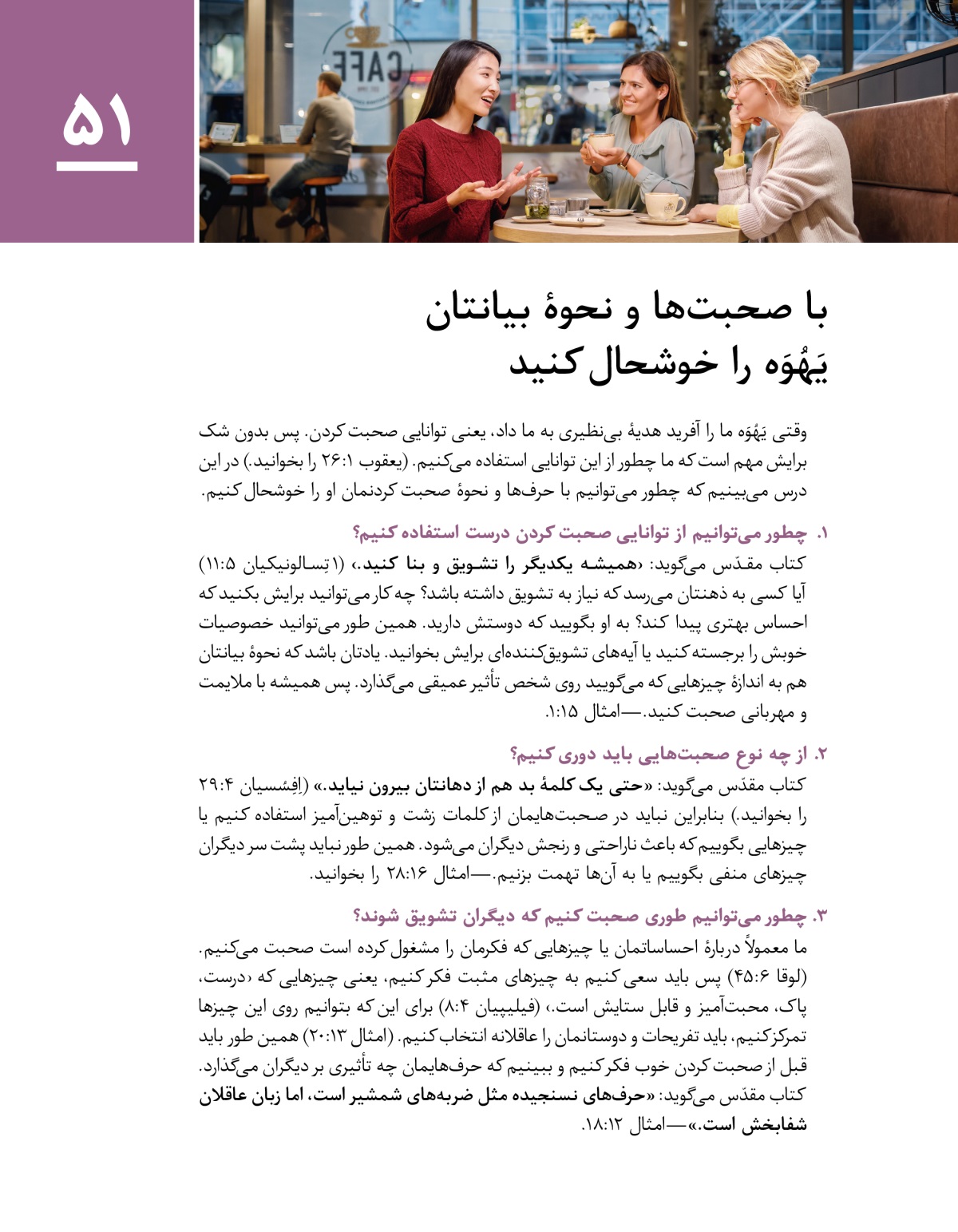 در این درس میبینیم که چطور میتوانیم با حرفها و نحوهٔ صحبت کردنمان باعث خوشحالی یَهُوَه و تشویق دیگران شویم.