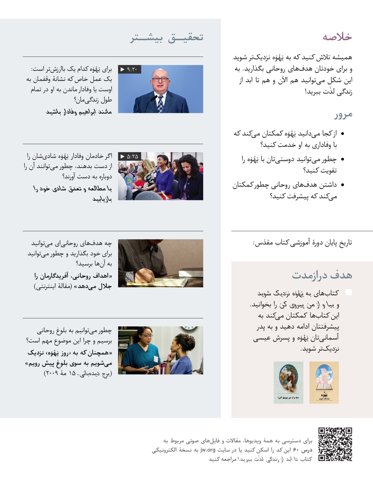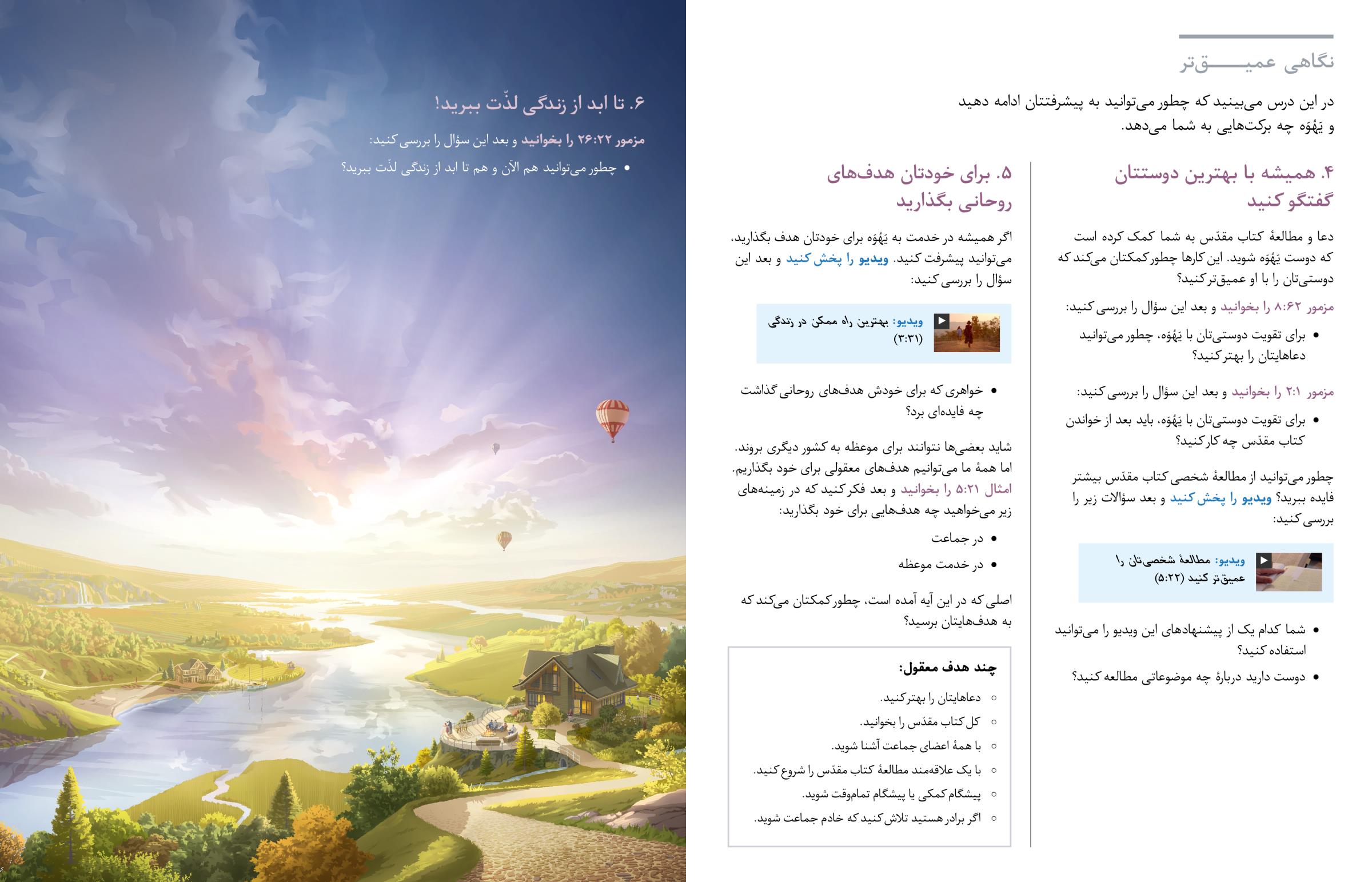 همیشه تلاش کنید که به یَهُوَه نزدیکتر شوید و برای خودتان هدفهای روحانی بگذارید. به این شکل میتوانید هم الآن و هم تا ابد از زندگی لذّت ببرید!
