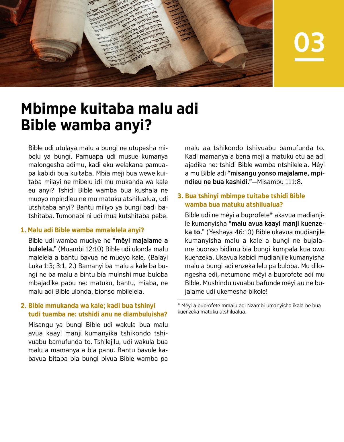 BAMUE BATU BAMBA NE: “Bible mmukanda wa mianu ne malu a tshiena kale.”