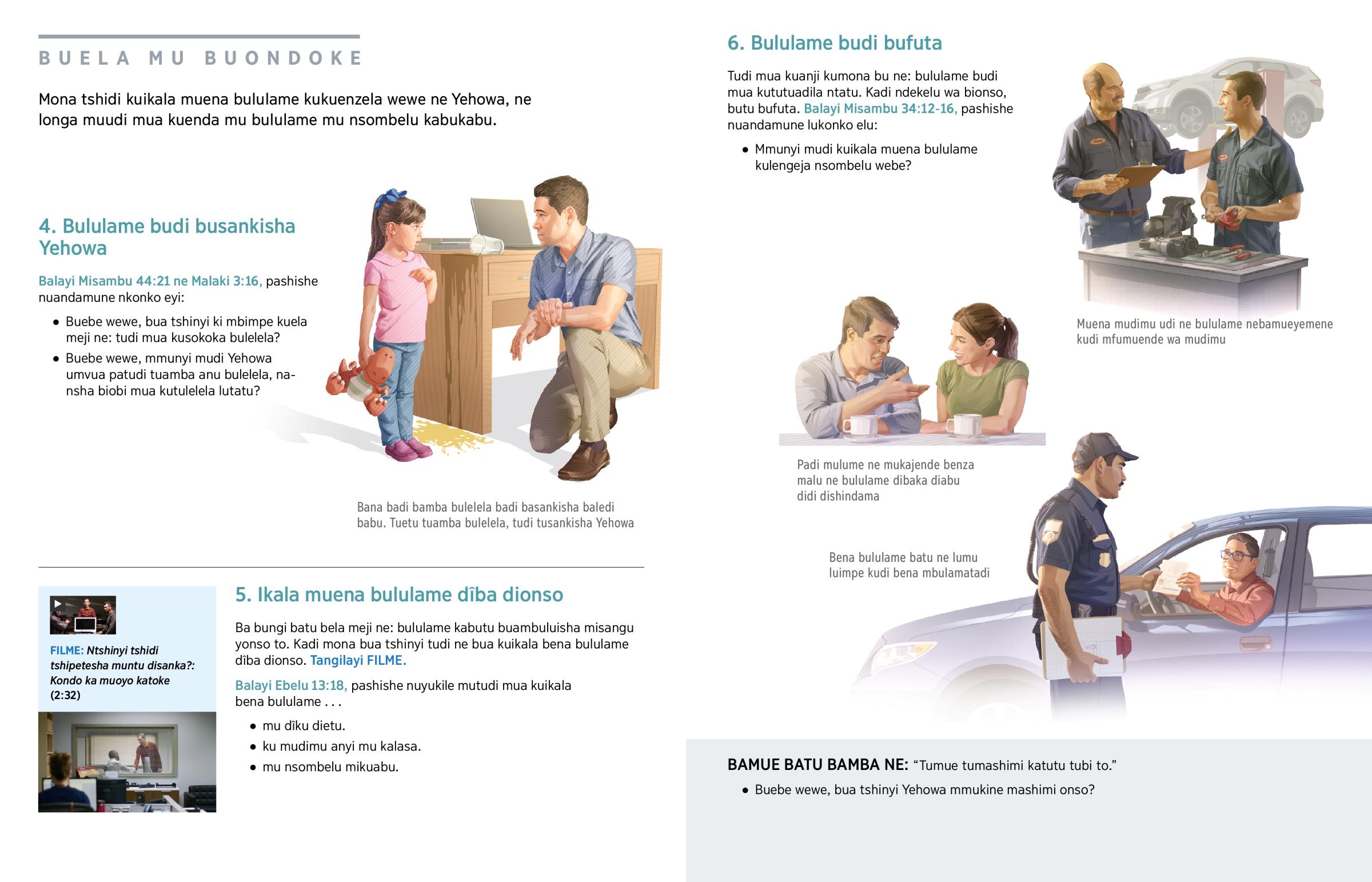 Patudi tuenzela bakuabu malu ne bululame, tudi tuleja Yehowa ne: tudi bamunange ne tudi tumunemeka. Manya ne: Yehowa mmumanye bionso bitudi tuelela meji ne tuenza. (Ebelu 4:13) Udi umona patudi tuenza malu ne bululame, ne udi usanka. Dîyi diende didi diamba ne: “Yehowa udi ukina muntu muena malu a bibenda, kadi bulunda buende bushême budi kudi bena bululame.”​—Nsumuinu 3:32.
