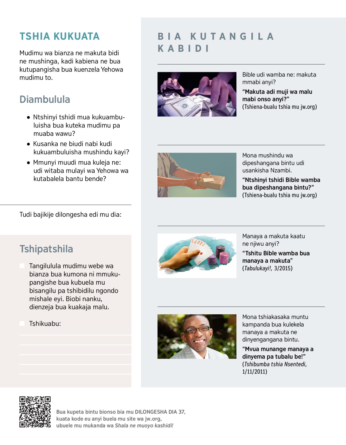 Ukadiku musamishe mutu bua mudimu peshi bua makuta anyi? Kabitu anu bipepele bua kudikumbajila majinga etu ne kutendelela kabidi Yehowa mudibi bikengela to. Mu Bible mudi mibelu mimpe idi mua kutuambuluisha.