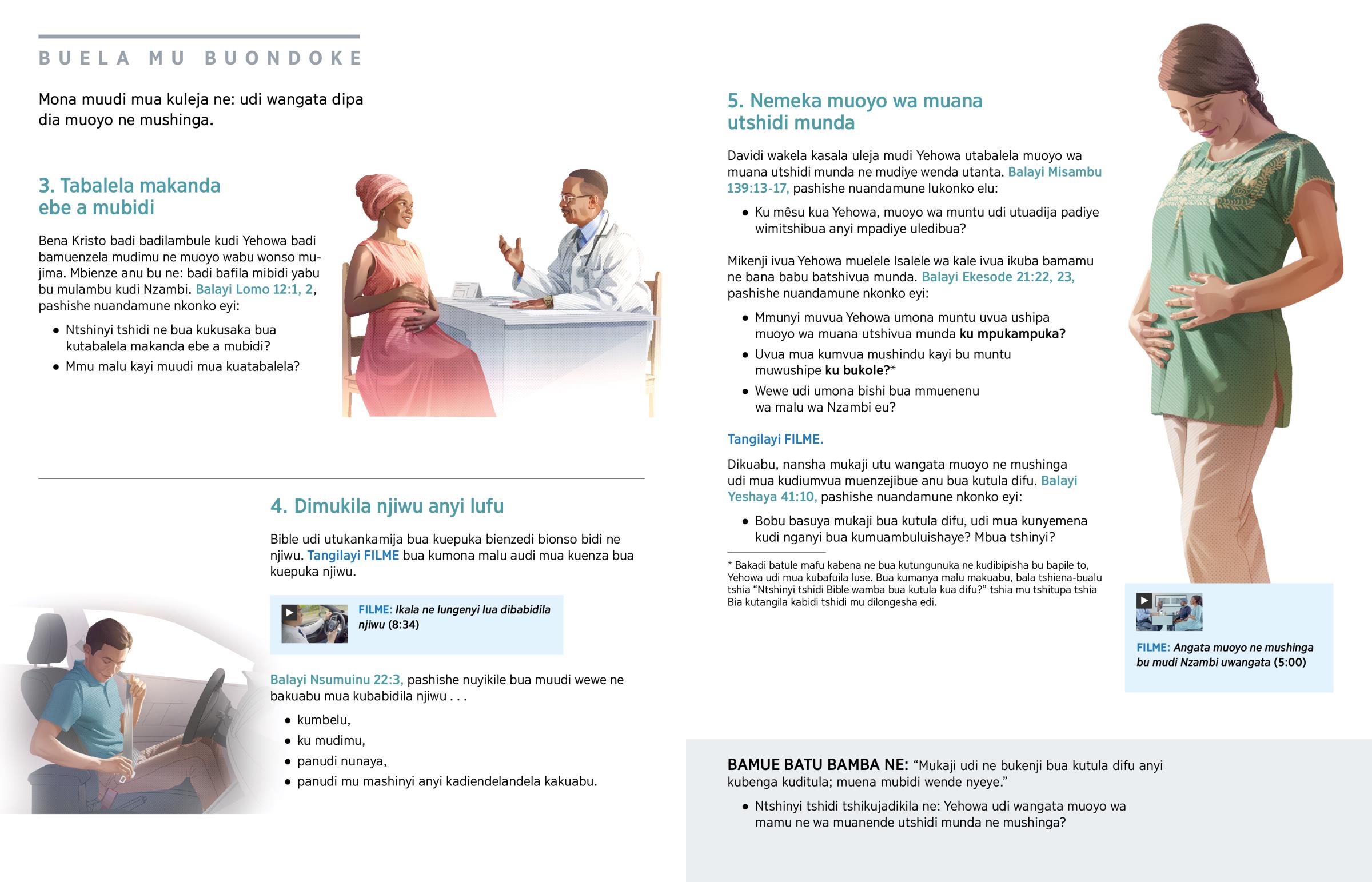 Yehowa wakatuadija kukutabalela anu katshia ku dimitshibua diebe. Ku bukole bua nyuma wa Nzambi, Davidi (mutendeledi wende wa kale) wakamuambila ne: “Mêsu ebe mine akammona pantshivua mukuji.” (Misambu 139:16) Yehowa udi wangata muoyo webe ne mushinga wa bungi. (Balayi Matayi 10:29-31.) Muntu yeye mushipe mukuabu ku bukole, anyi mudishipe yeye muine, Yehowa udi unyingalala bikole.a (Ekesode 20:13) Yehowa udi unyingalala kabidi patudi tuditeka mu njiwu kakuyi bualu anyi katuyi tubabidila bua kukuba mioyo ya bakuabu. Patudi tutabalela muoyo wetu ne tunemeka wa bakuabu, tudi tuleja mutudi tuangata dipa dia dikema dia muoyo edi ne mushinga.