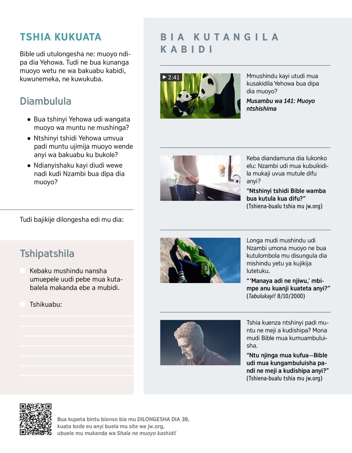 Mbimpe kuangata muoyo ne mushinga bualu ndipa didi Yehowa Tatu wetu wa dinanga mutupeshe. Yeye ke “mpokolo wa muoyo,” bualu wakafuka bionso bidi ne muoyo. (Misambu 36:9) “Yeye muine ke udi upesha bantu bonso muoyo, ne mueyelu ne bintu bionso.” (Bienzedi 17:25, 28) Yehowa udi utupa bitudi tukengela bua kushala ne muoyo. Pa kumbusha atshi, udi kabidi utukuatshisha ne bionso bidi bikengedibua bua muoyo kuikalwu utusankisha.—Balayi Bienzedi 14:17.