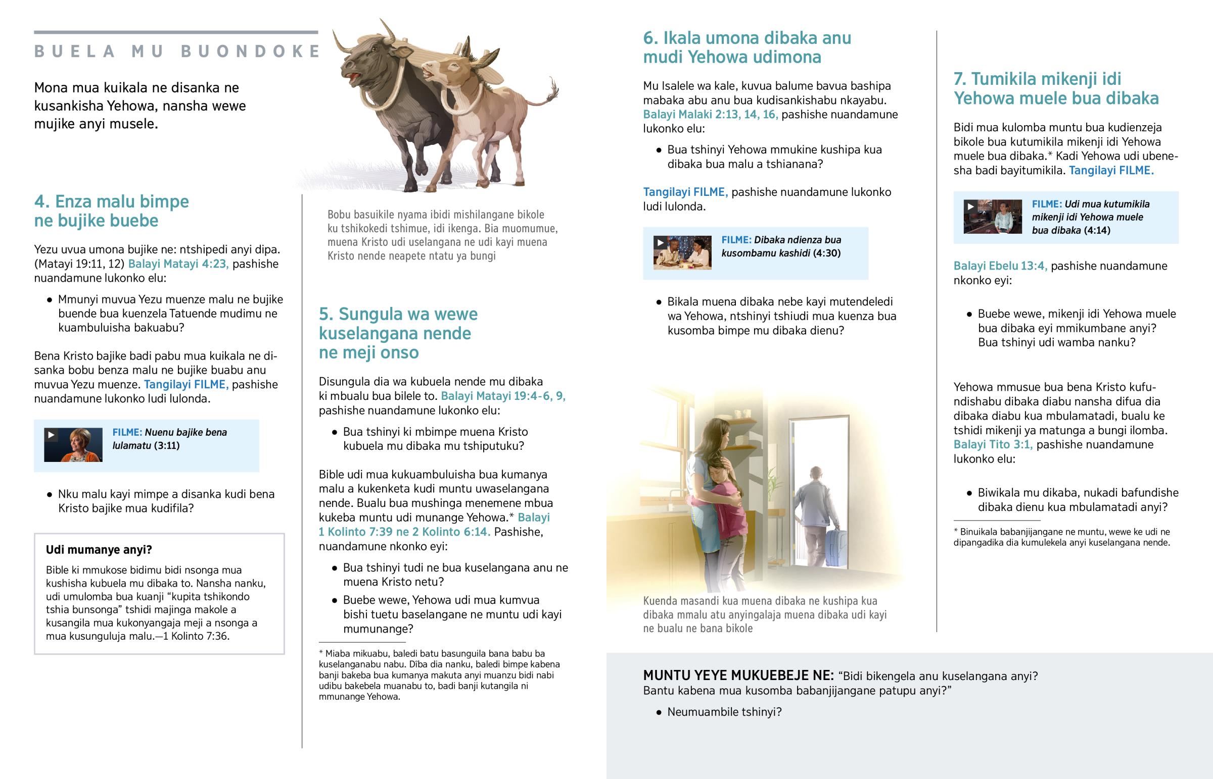 Bible udi mua kukuambuluisha bua kumanya malu a kukenketa kudi muntu uwaselangana nende. Bualu bua mushinga menemene mbua kukeba muntu udi munange Yehowa.b Balayi 1 Kolinto 7:39 ne 2 Kolinto 6:14. Pashishe, nuandamune nkonko eyi: