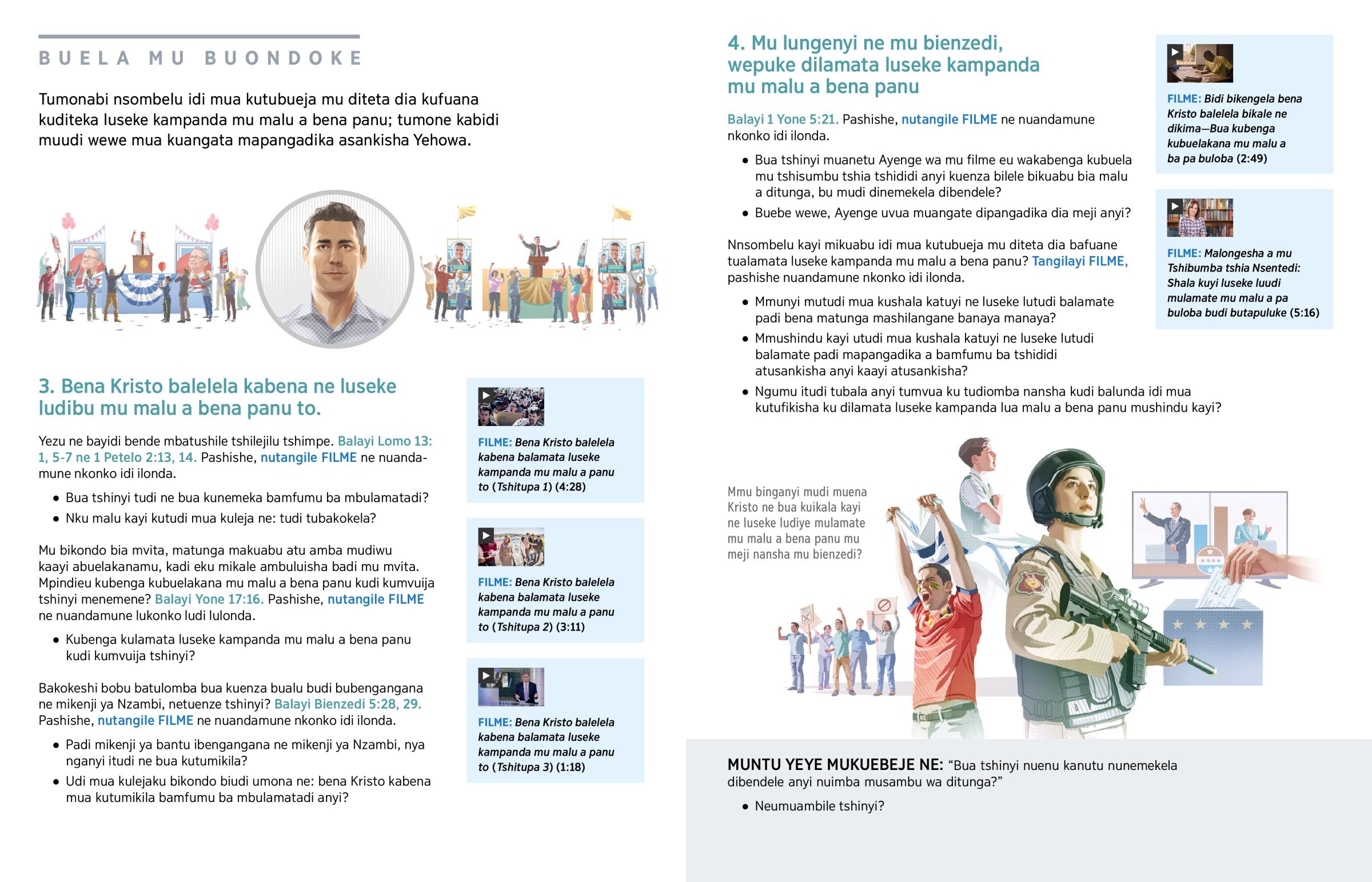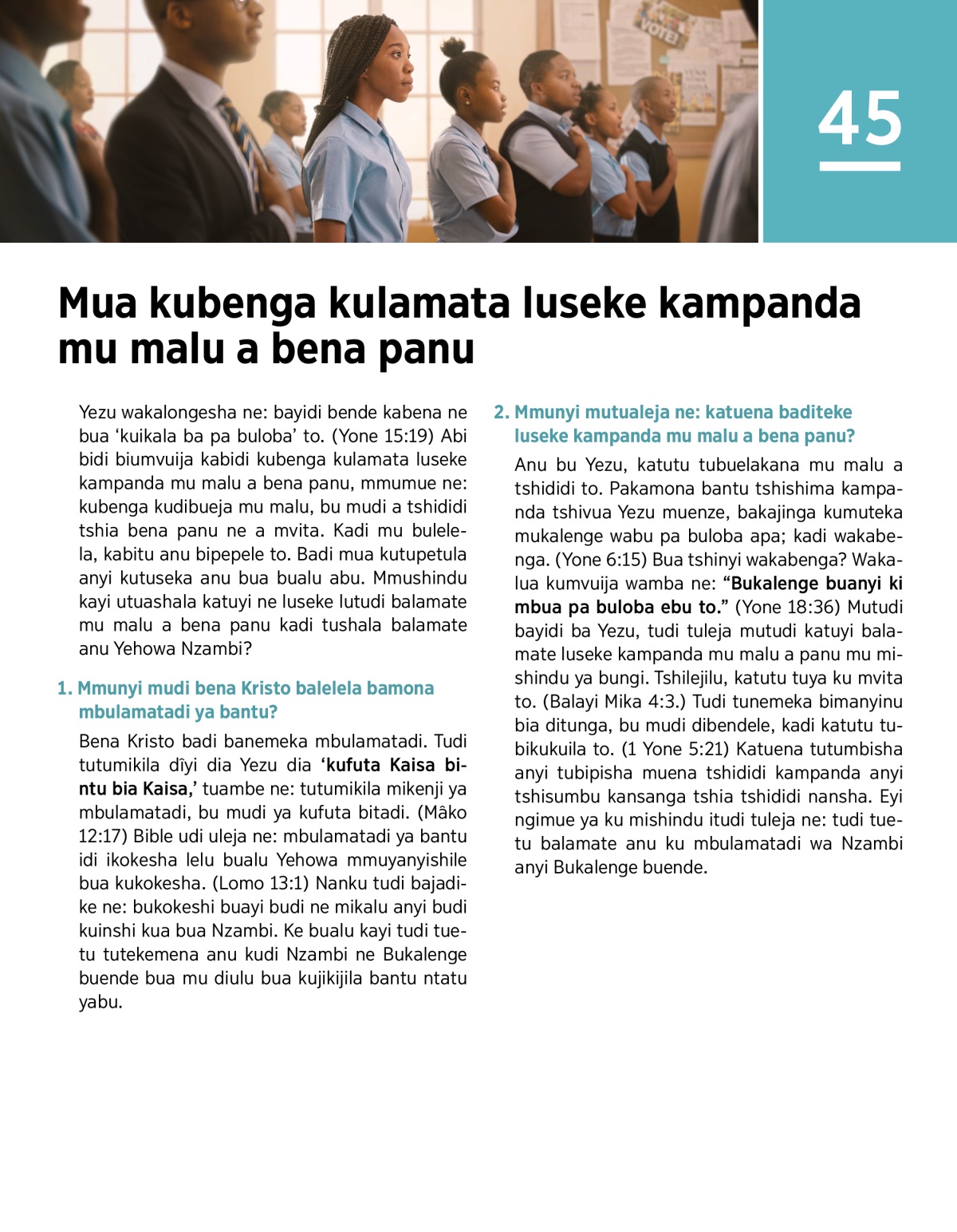Anu bu Yezu, katutu tubuelakana mu malu a tshididi to. Pakamona bantu tshishima kampanda tshivua Yezu muenze, bakajinga kumuteka mukalenge wabu pa buloba apa; kadi wakabenga. (Yone 6:15) Bua tshinyi wakabenga? Wakalua kumvuija wamba ne: “Bukalenge buanyi ki mbua pa buloba ebu to.” (Yone 18:36) Mutudi bayidi ba Yezu, tudi tuleja mutudi katuyi balamate luseke kampanda mu malu a panu mu mishindu ya bungi. Tshilejilu, katutu tuya ku mvita to. (Balayi Mika 4:3.) Tudi tunemeka bimanyinu bia ditunga, bu mudi dibendele, kadi katutu tubikukuila to. (1 Yone 5:21) Katuena tutumbisha anyi tubipisha muena tshididi kampanda anyi tshisumbu kansanga tshia tshididi nansha. Eyi ngimue ya ku mishindu itudi tuleja ne: tudi tuetu balamate anu ku mbulamatadi wa Nzambi anyi Bukalenge buende.