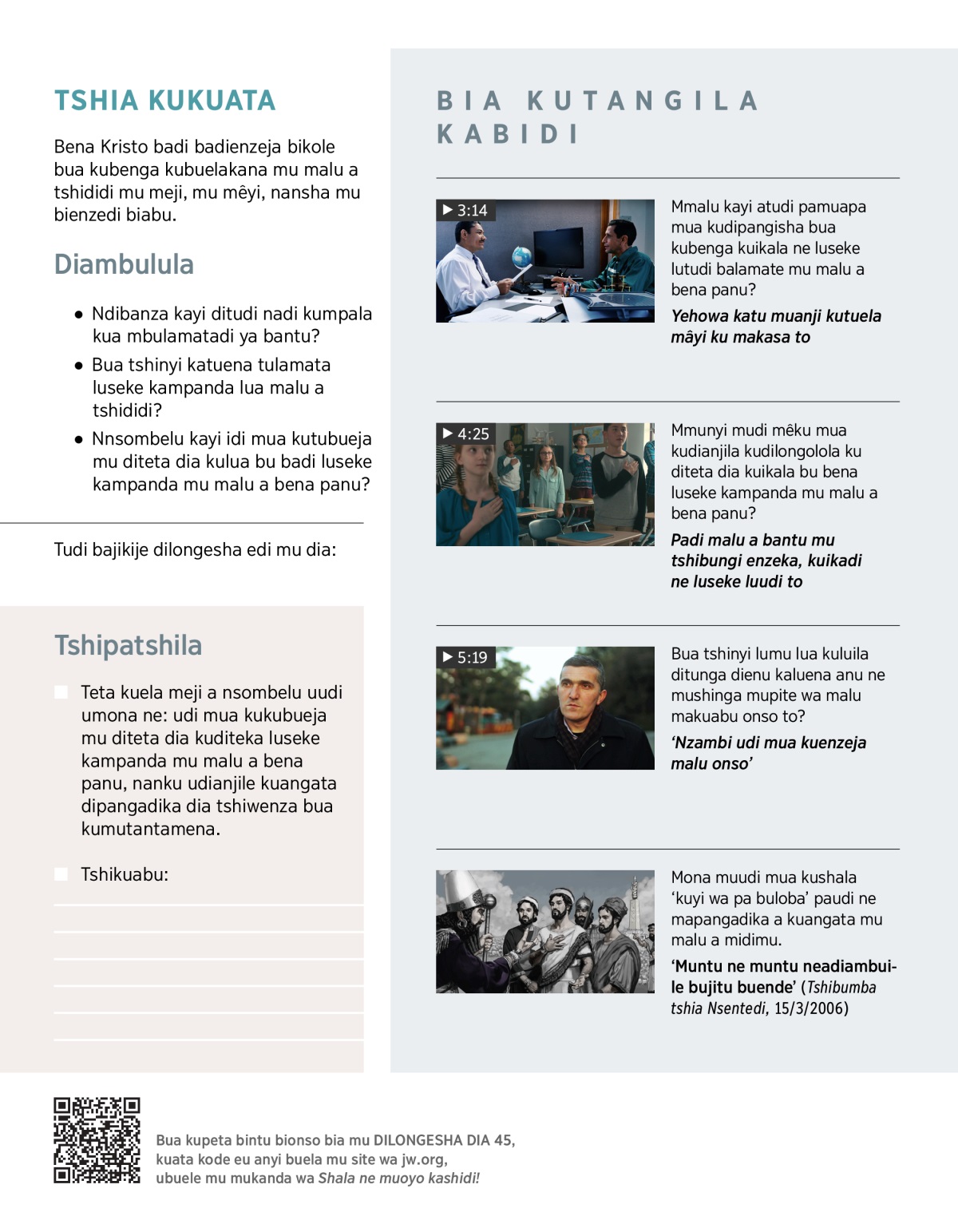 Tumonabi nsombelu idi mua kutubueja mu diteta dia kufuana kuditeka luseke kampanda mu malu a bena panu; tumone kabidi muudi wewe mua kuangata mapangadika asankisha Yehowa.