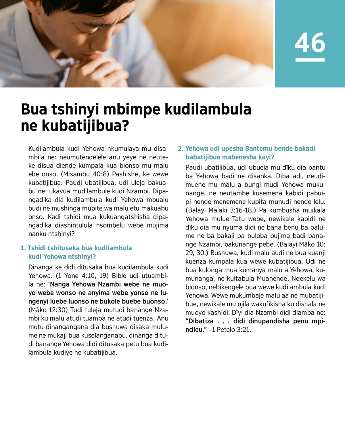 Paudi ubatijibua, udi ubuela mu dîku dia bantu ba Yehowa badi ne disanka. Dîba adi, neudimuene mu malu a bungi mudi Yehowa mukunange, ne neutambe kusemena kabidi pabuipi nende menemene kupita munudi nende lelu. (Balayi Malaki 3:16-18.) Pa kumbusha muikala Yehowa mulue Tatu webe, newikale kabidi ne dîku dia mu nyuma didi ne bana benu ba balume ne ba bakaji pa buloba bujima badi banange Nzambi, bakunange pebe. (Balayi Mâko 10:29, 30.) Bushuwa, kudi malu audi ne bua kuanji kuenza kumpala kua wewe kubatijibua. Udi ne bua kulonga mua kumanya malu a Yehowa, kumunanga, ne kuitabuja Muanende. Ndekelu wa bionso, nebikengele bua wewe kudilambula kudi Yehowa. Wewe mukumbaje malu aa ne mubatijibue, newikale mu njila wakufikisha ku dishala ne muoyo kashidi. Dîyi dia Nzambi didi diamba ne: “Dibatiza . . . didi dinupandisha penu mpindieu.”—1 Petelo 3:21.