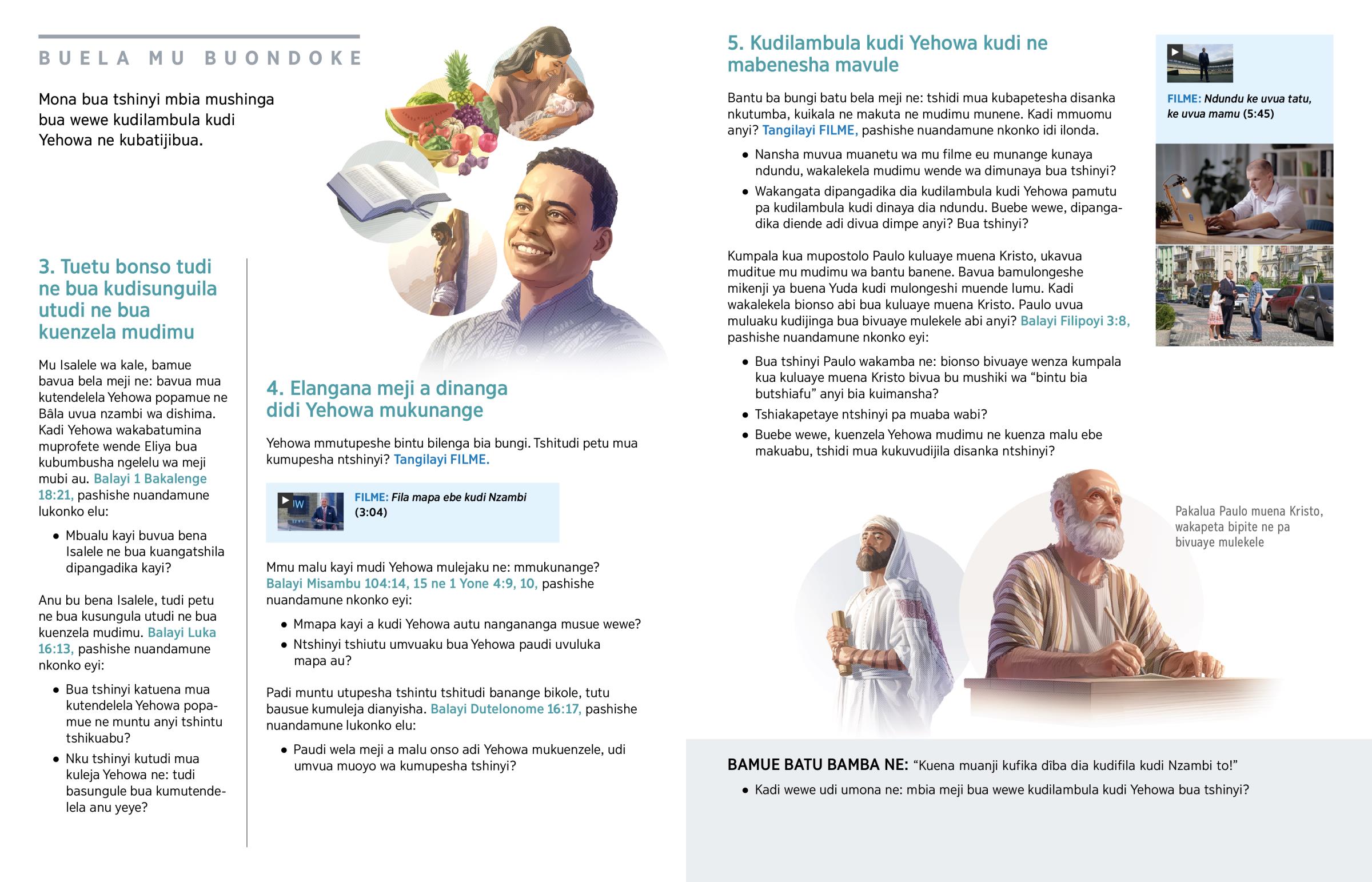 Mmu malu kayi mudi Yehowa mulejaku ne: mmukunange? Balayi Misambu 104:14, 15 ne 1 Yone 4:9, 10, pashishe nuandamune nkonko eyi: