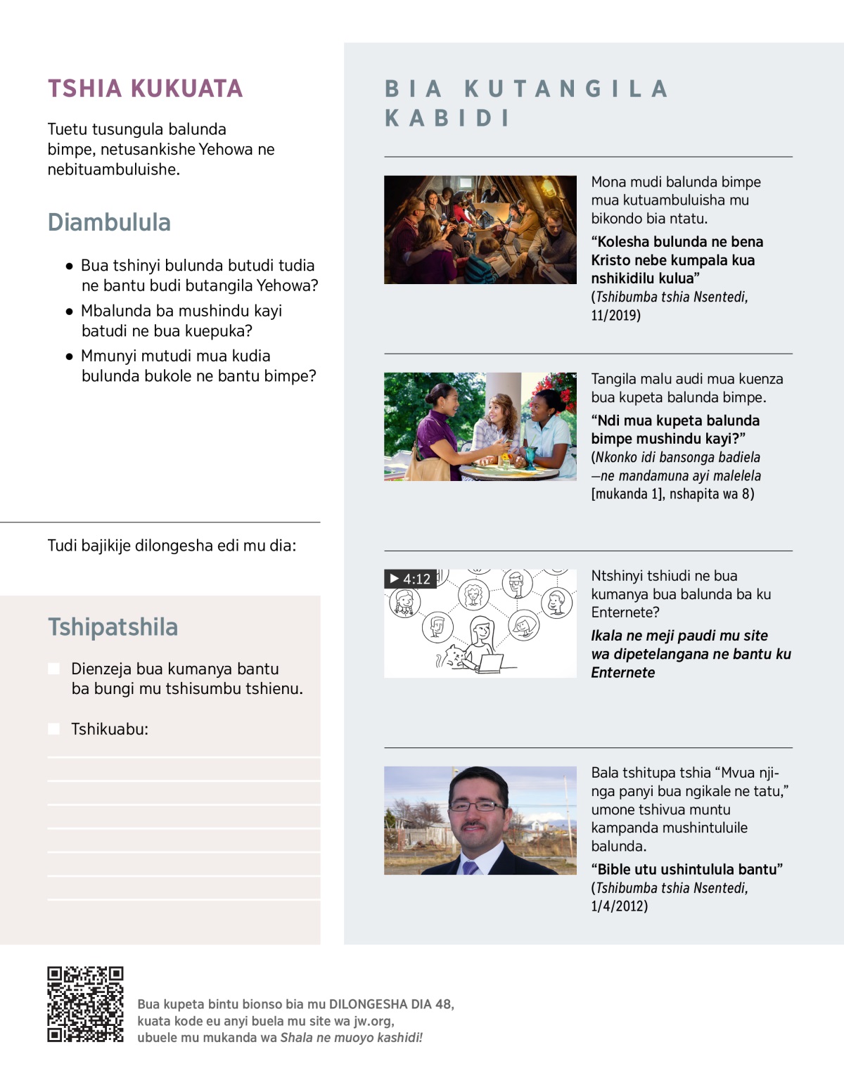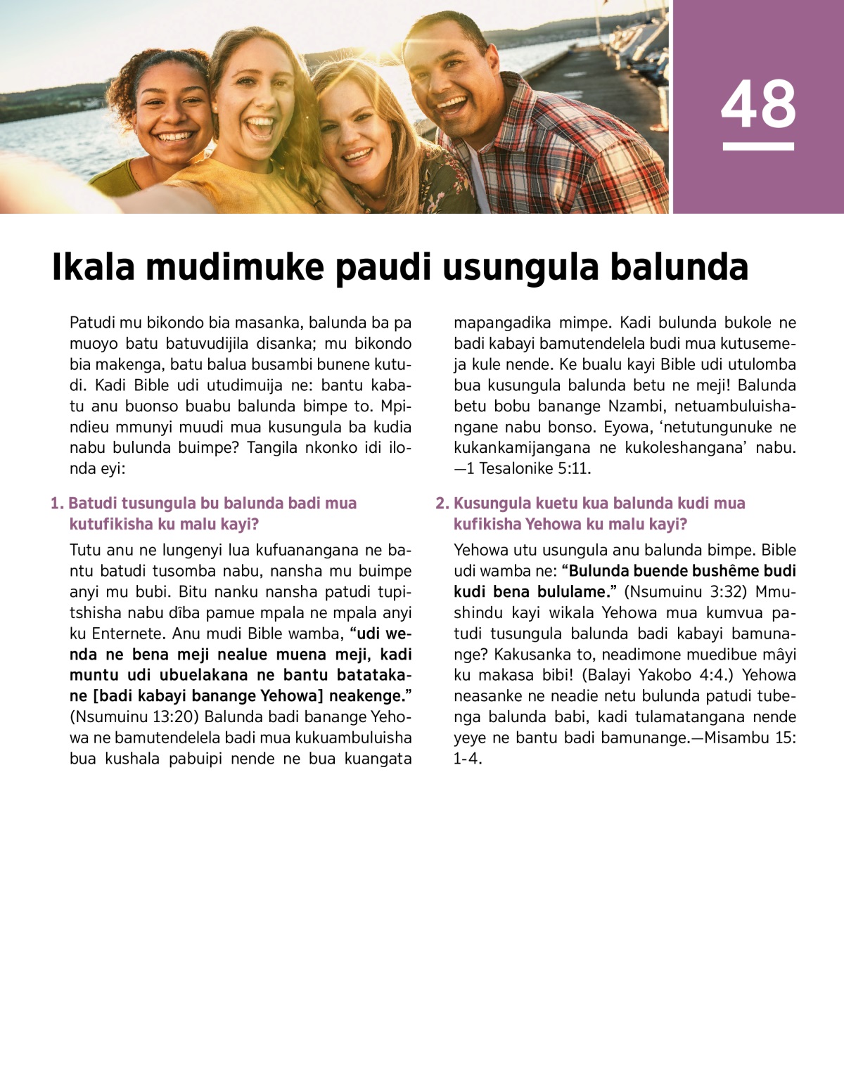 Tutu anu ne lungenyi lua kufuanangana ne bantu batudi tusomba nabu, nansha mu buimpe anyi mu bubi. Bitu nanku nansha patudi tupitshisha nabu dîba pamue mpala ne mpala anyi ku Enternete. Anu mudi Bible wamba, “udi wenda ne bena meji nealue muena meji, kadi muntu udi ubuelakana ne bantu batatakane [badi kabayi banange Yehowa] neakenge.” (Nsumuinu 13:20) Balunda badi banange Yehowa ne bamutendelela badi mua kukuambuluisha bua kushala pabuipi nende ne bua kuangata mapangadika mimpe. Kadi bulunda bukole ne badi kabayi bamutendelela budi mua kutusemeja kule nende. Ke bualu kayi Bible udi utulomba bua kusungula balunda betu ne meji! Balunda betu bobu banange Nzambi, netuambuluishangane nabu bonso. Eyowa, ‘netutungunuke ne kukankamijangana ne kukoleshangana’ nabu.—1 Tesalonike 5:11.