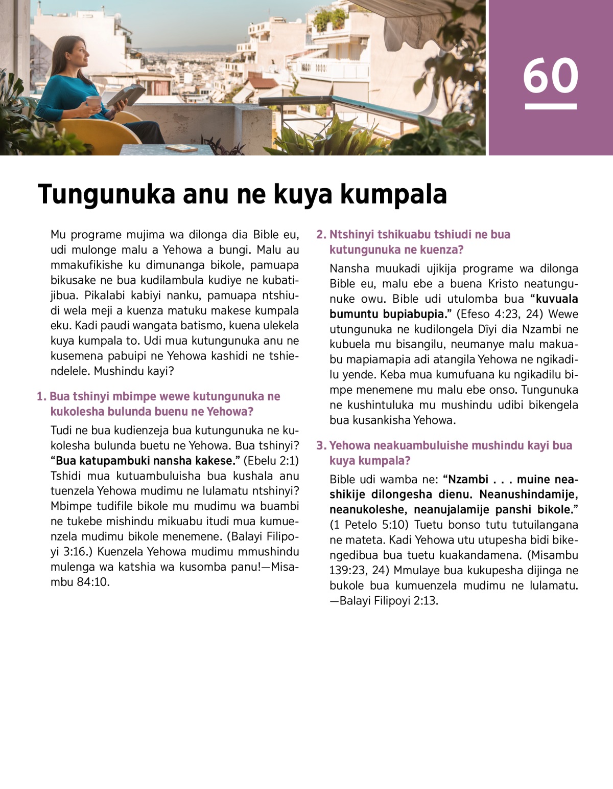 Nansha muukadi ujikija programe wa dilonga Bible eu, malu ebe a buena Kristo neatungunuke owu. Bible udi utulomba bua “kuvuala bumuntu bupiabupia.” (Efeso 4:23, 24) Wewe utungunuka ne kudilongela Dîyi dia Nzambi ne kubuela mu bisangilu, neumanye malu makuabu mapiamapia adi atangila Yehowa ne ngikadilu yende. Keba mua kumufuana ku ngikadilu bimpe menemene mu malu ebe onso. Tungunuka ne kushintuluka mu mushindu udibi bikengela bua kusankisha Yehowa.