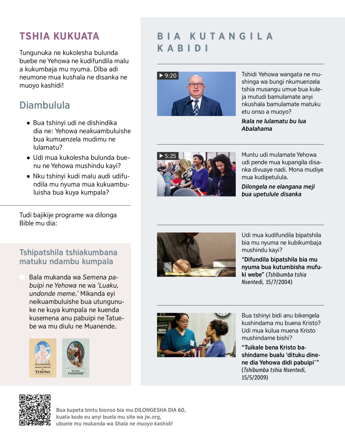 Mu programe mujima wa dilonga dia Bible eu, udi mulonge malu a Yehowa a bungi. Malu au mmakufikishe ku dimunanga bikole, pamuapa bikusake ne bua kudilambula kudiye ne kubatijibua. Pikalabi kabiyi nanku, pamuapa ntshiudi wela meji a kuenza matuku makese kumpala eku. Kadi paudi wangata batismo, kuena ulekela kuya kumpala to. Udi mua kutungunuka anu ne kusemena pabuipi ne Yehowa kashidi ne tshiendelele. Mushindu kayi?
