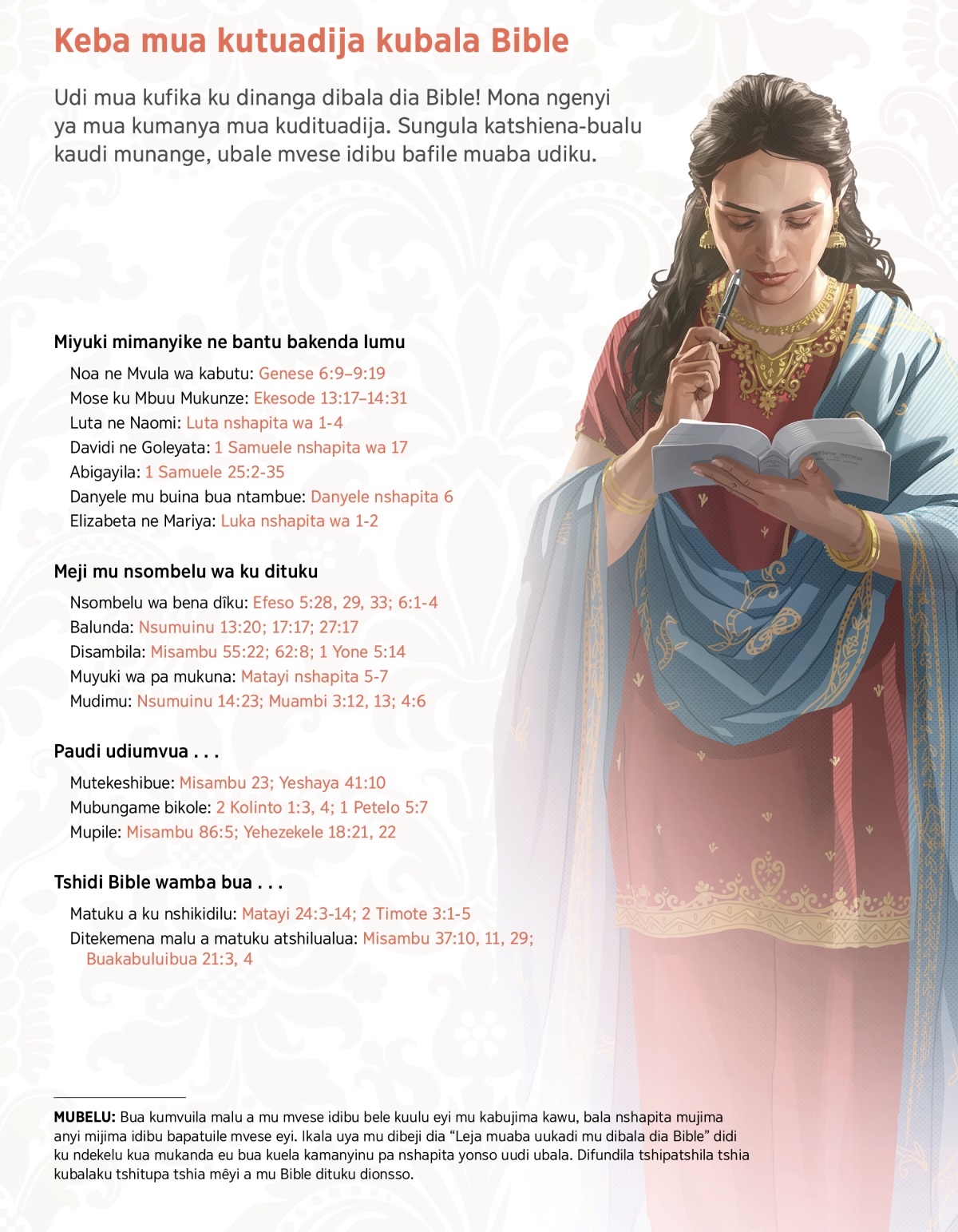 MUBELU: Bua kumvuila malu a mu mvese idibu bele kuulu eyi mu kabujima kawu, bala nshapita mujima anyi mijima idibu bapatuile mvese eyi. Ikala uya mu dibeji dia “Leja muaba uukadi mu dibala dia Bible” didi ku ndekelu kua mukanda eu bua kuela kamanyinu pa nshapita yonso uudi ubala. Difundila tshipatshila tshia kubalaku tshitupa tshia mêyi a mu Bible dituku dionso.