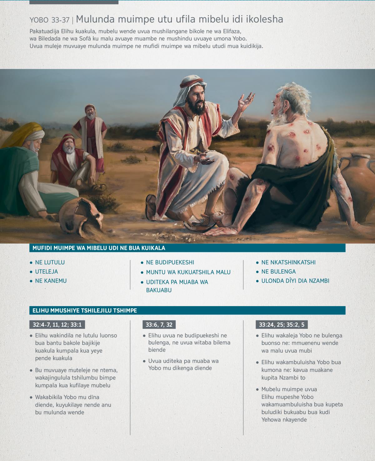 Pakatuadija Elihu kuakula, mubelu wende uvua mushilangane bikole ne wa Elifaza, wa Biledada ne wa Sofâ ku malu avuaye muambe ne mushindu uvuaye umona Yobo. Uvua muleje muvuaye mulunda muimpe ne mufidi muimpe wa mibelu utudi mua kuidikija.