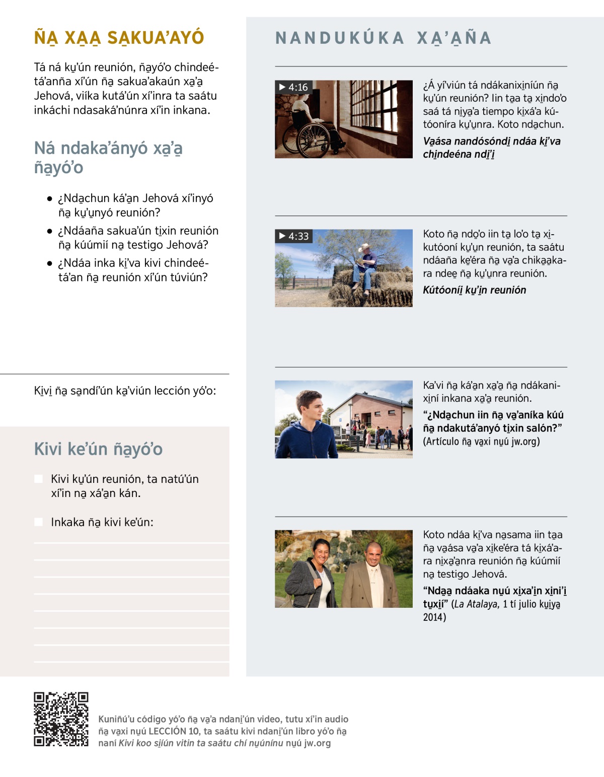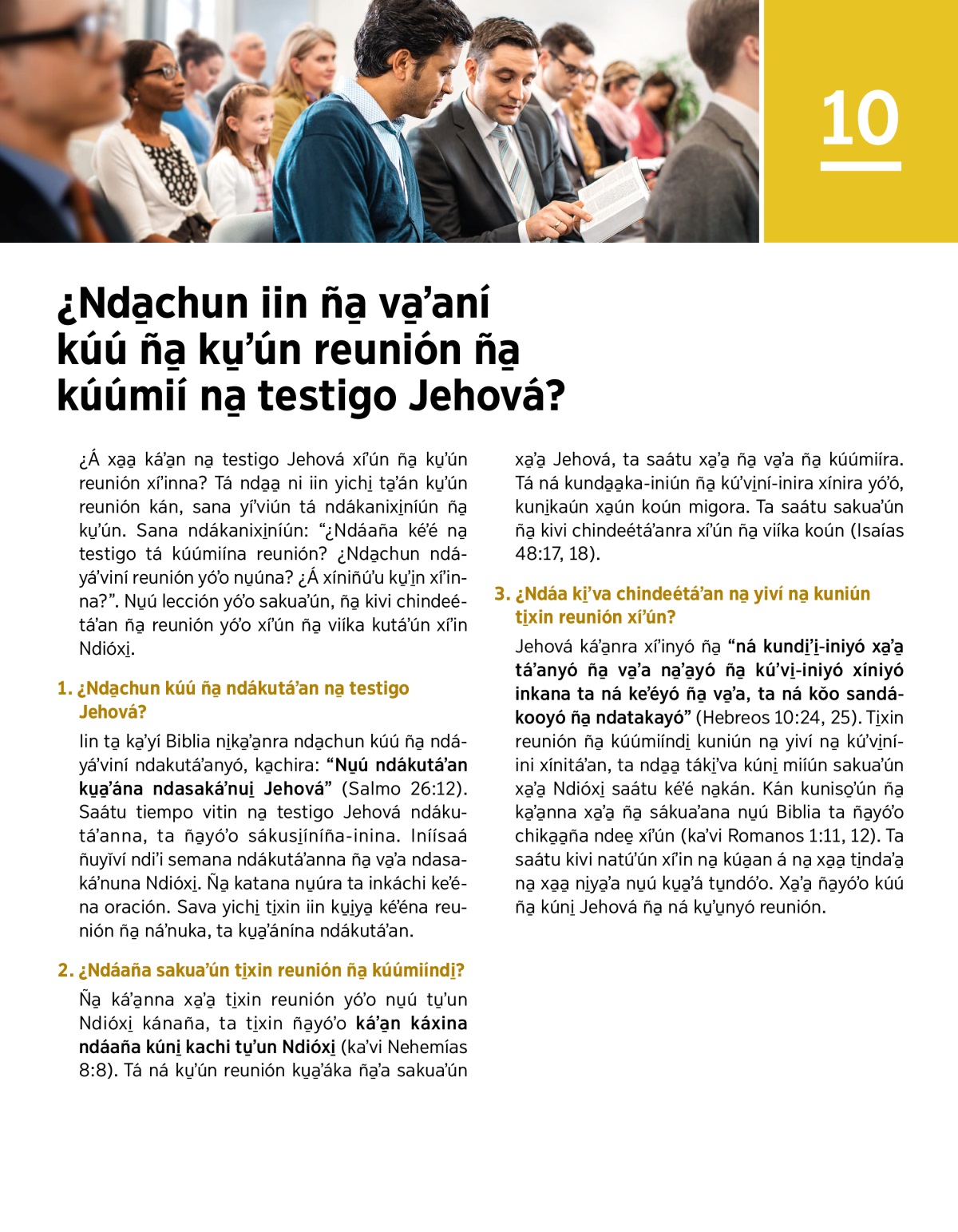 ¿Á xa̱a̱ káʼa̱n na̱ testigo Jehová xíʼún ña̱ ku̱ʼún reunión xíʼinna? Tá nda̱a̱ ni iin yichi̱ ta̱ʼán ku̱ʼún reunión kán, sana yíʼviún tá ndákanixi̱níún ña̱ ku̱ʼún. Sana ndákanixi̱níún: “¿Ndáaña kéʼé na̱ testigo tá kúúmiína reunión? ¿Nda̱chun ndáyáʼviní reunión yóʼo nu̱úna? ¿Á xíniñúʼu ku̱ʼi̱n xíʼinna?”. Nu̱ú lección yóʼo sakuaʼún, ña̱ kivi chindeétáʼan ña̱ reunión yóʼo xíʼún ña̱ viíka kutáʼún xíʼin Ndióxi̱.