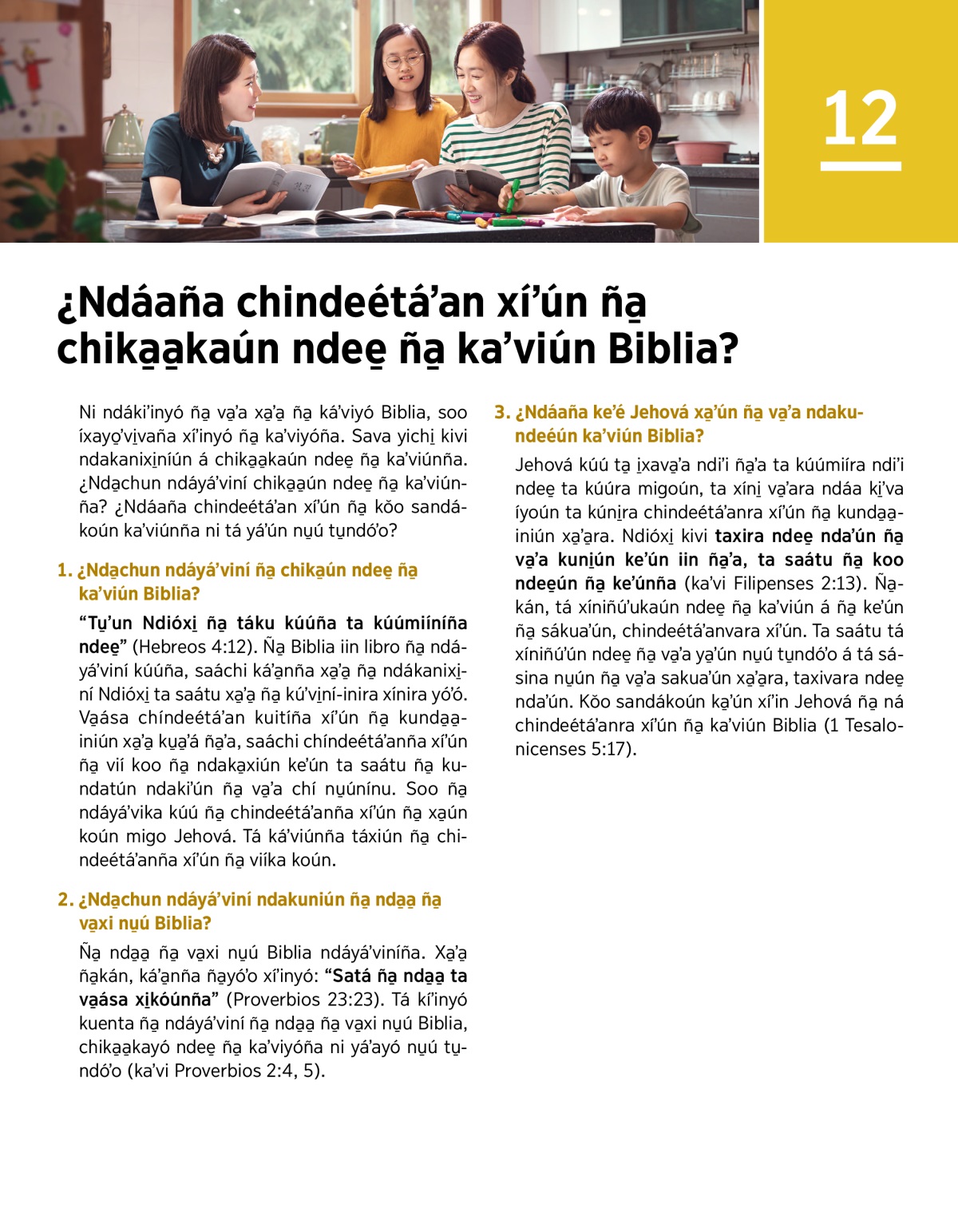 “Tu̱ʼun Ndióxi̱ ña̱ táku kúúña ta kúúmiíníña ndee̱” (Hebreos 4:12). Ña̱ Biblia iin libro ña̱ ndáyáʼviní kúúña, saáchi káʼa̱nña xa̱ʼa̱ ña̱ ndákanixi̱ní Ndióxi̱ ta saátu xa̱ʼa̱ ña̱ kúʼvi̱ní-inira xínira yóʼó. Va̱ása chíndeétáʼan kuitíña xíʼún ña̱ kunda̱a̱-iniún xa̱ʼa̱ ku̱a̱ʼá ña̱ʼa, saáchi chíndeétáʼanña xíʼún ña̱ vií koo ña̱ ndaka̱xiún keʼún ta saátu ña̱ kundatún ndakiʼún ña̱ va̱ʼa chí nu̱únínu. Soo ña̱ ndáyáʼvika kúú ña̱ chindeétáʼanña xíʼún ña̱ xa̱ún koún migo Jehová. Tá káʼviúnña táxiún ña̱ chindeétáʼanña xíʼún ña̱ viíka koún.