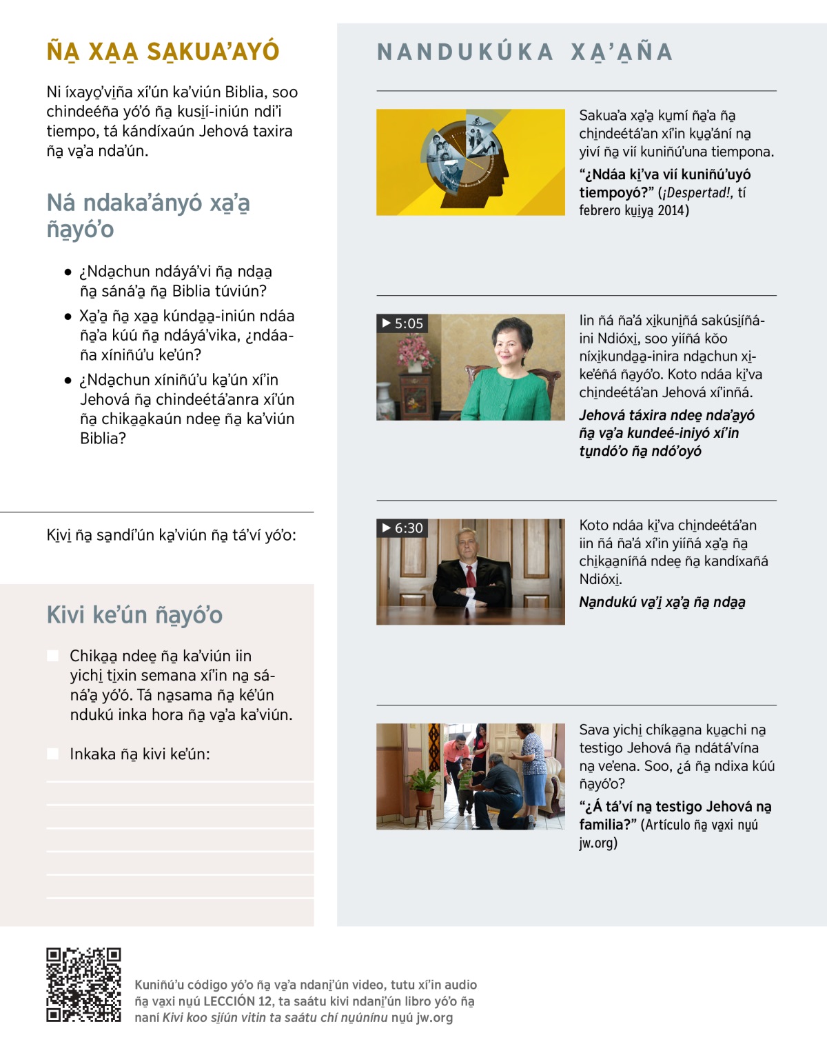 ÑA̱ NDÁKA̱TU̱ʼUN SAVA NA̱ YIVÍ: “¿Ta yóʼó nda̱chun kúú ña̱ káʼviún Biblia?”.