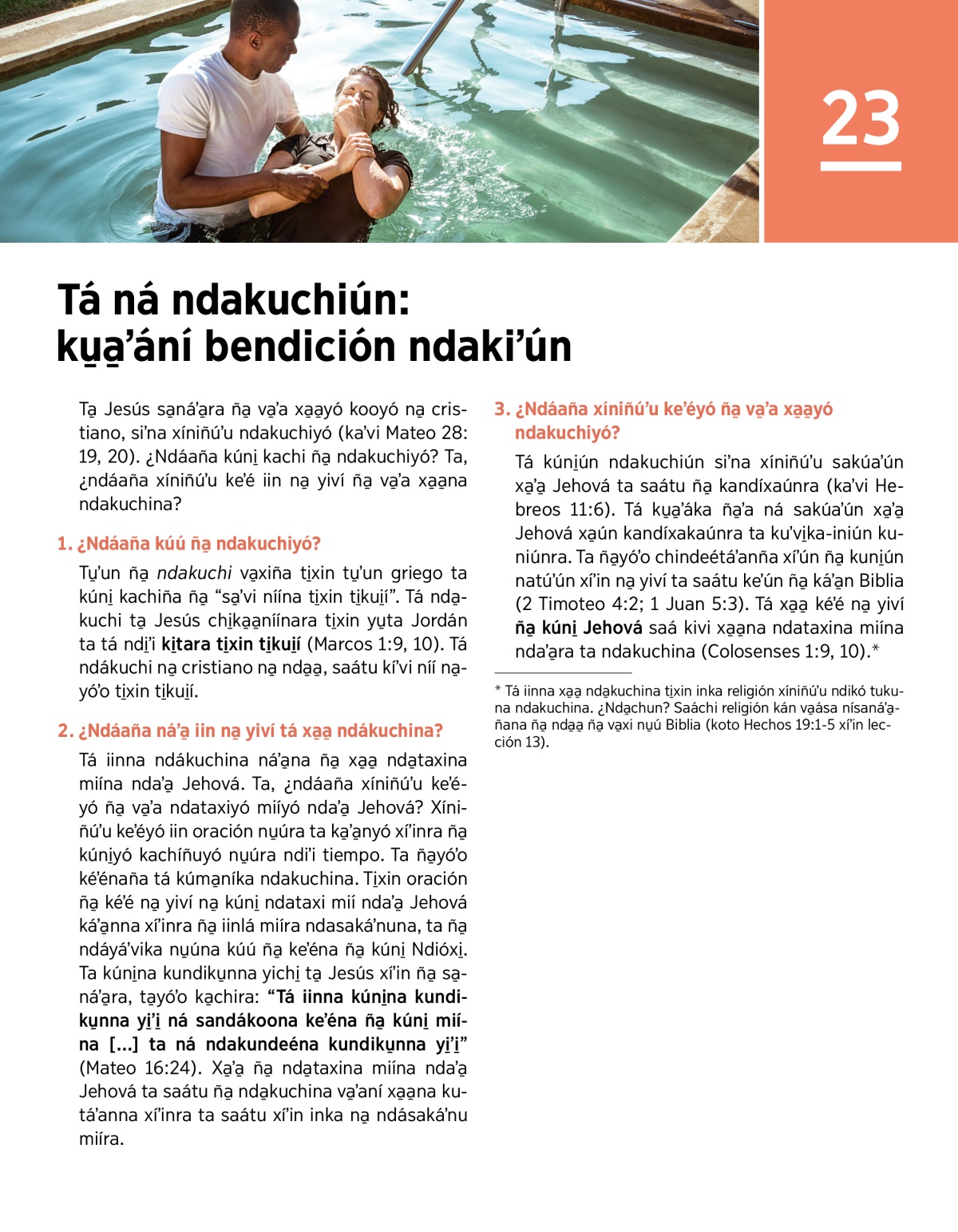Tá kúni̱ún ndakuchiún siʼna xíniñúʼu sakúaʼún xa̱ʼa̱ Jehová ta saátu ña̱ kandíxaúnra (kaʼvi Hebreos 11:6). Tá ku̱a̱ʼáka ña̱ʼa ná sakúaʼún xa̱ʼa̱ Jehová xa̱ún kandíxakaúnra ta kuʼvi̱ka-iniún kuniúnra. Ta ña̱yóʼo chindeétáʼanña xíʼún ña̱ kuni̱ún natúʼún xíʼin na̱ yiví ta saátu keʼún ña̱ káʼa̱n Biblia (2 Timoteo 4:2; 1 Juan 5:3). Tá xa̱a̱ kéʼé na̱ yiví ña̱ kúni̱ Jehová saá kivi xa̱a̱na ndataxina miína ndaʼa̱ra ta ndakuchina (Colosenses 1:9, 10).a