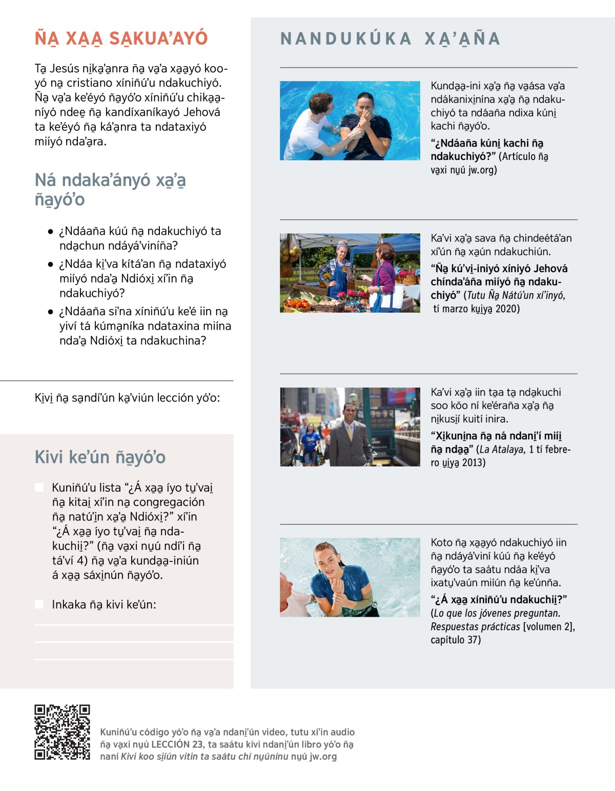 Ta̱ Jesús sa̱náʼa̱ra ña̱ va̱ʼa xa̱a̱yó kooyó na̱ cristiano, siʼna xíniñúʼu ndakuchiyó (kaʼvi Mateo 28:19, 20). ¿Ndáaña kúni̱ kachi ña̱ ndakuchiyó? Ta, ¿ndáaña xíniñúʼu keʼé iin na̱ yiví ña̱ va̱ʼa xa̱a̱na ndakuchina?