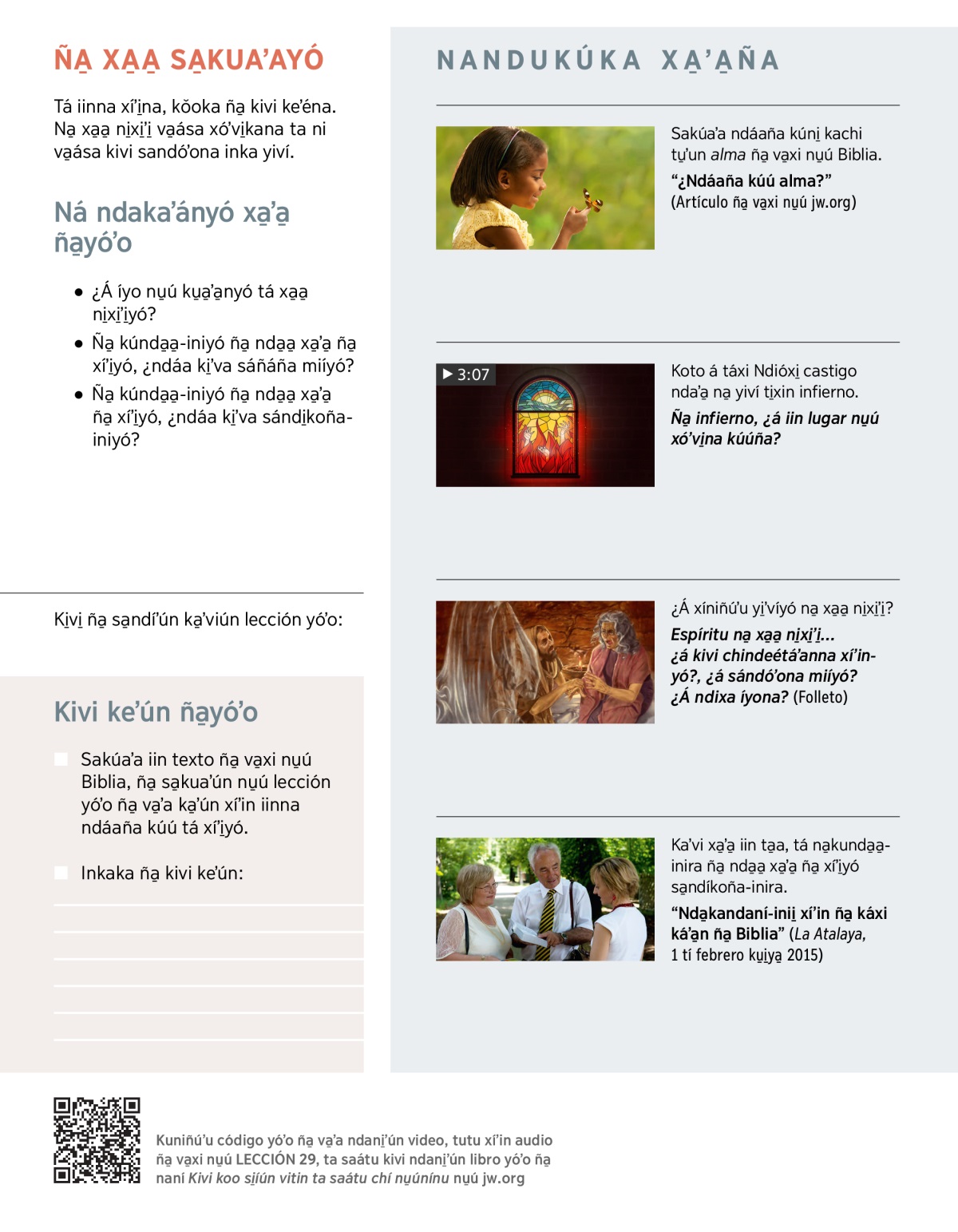 Tá kúnda̱a̱-iniyó ña̱ nda̱a̱ xa̱ʼa̱ ña̱ xíʼi̱yó va̱ása yíʼvikayó na̱ xa̱a̱ ni̱xi̱ʼi̱. Kaʼvindó Eclesiastés 9:10 ta ka̱ʼa̱nndó xa̱ʼa̱ ña̱yóʼo: