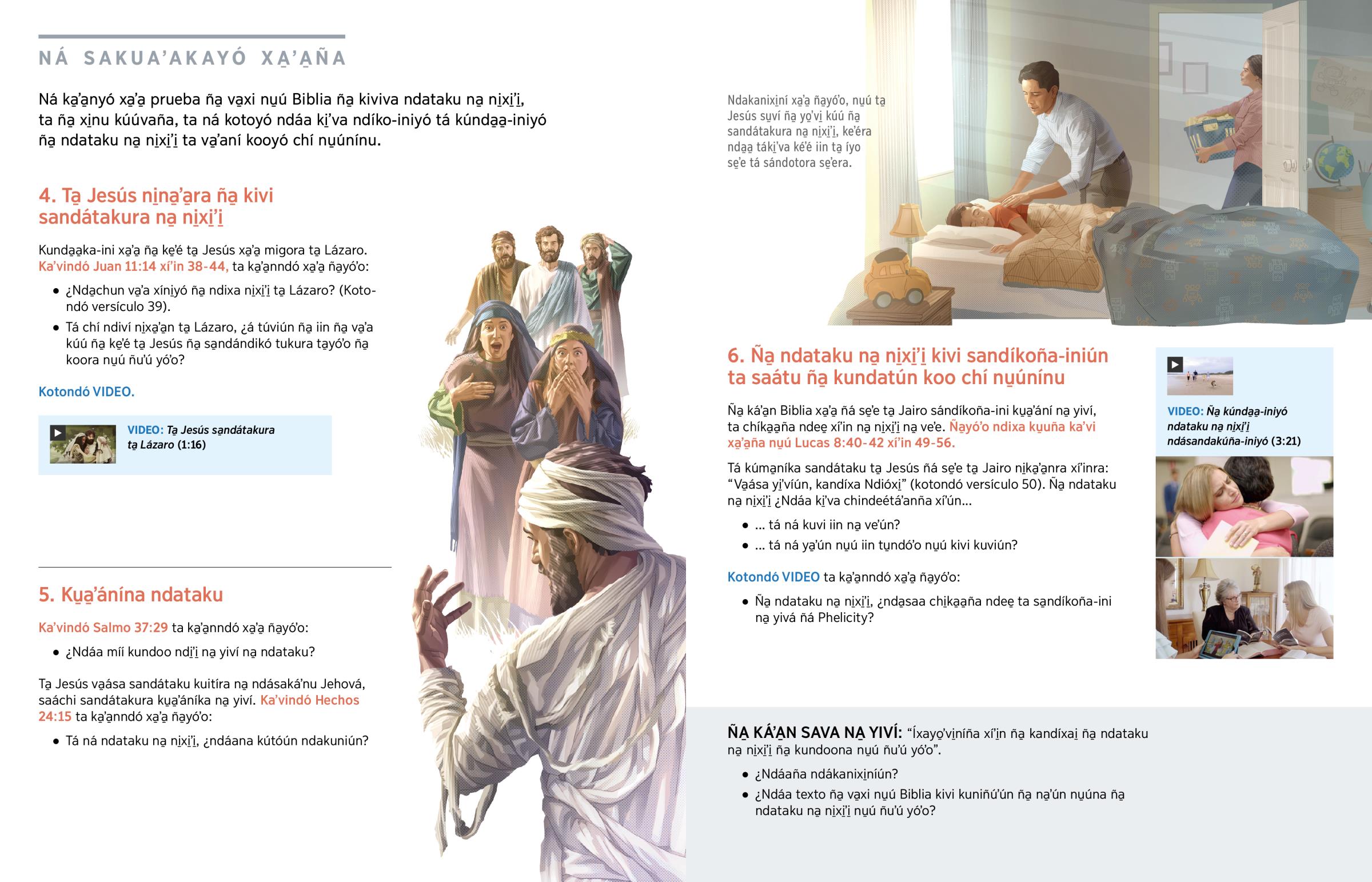 Tá ni̱xi̱yo ta̱ Jesús nu̱ú ñuʼú yóʼo, Ndióxi̱ ta̱xira ndee̱ ndaʼa̱ra ña̱ va̱ʼa sa̱ndátakura na̱ yiví. Xa̱ʼa̱ ña̱kán ta̱ Jesús sa̱ndátakura iin ñá loʼo ñá xi̱kuumií 12 ku̱i̱ya̱ xíʼin iin ta̱ loʼo se̱ʼé iin ñá ni̱xi̱ʼi̱ yií (Marcos 5:41, 42; Lucas 7:12-15). Tá ni̱ya̱ʼa tiempo ni̱xi̱ʼi̱ migora ta̱ Lázaro. Ni xa̱a̱ ni̱ya̱ʼa ku̱mí ki̱vi̱ ña̱ ni̱xi̱ʼi̱ra ta sa̱ndúxu̱nnara, ta̱ Jesús sa̱ndátakurara. Tándi̱ʼi ni̱ka̱ʼa̱nra xíʼin Ndióxi̱, ndeé va̱ʼa ka̱nara: “Lázaro, kita”. “Ta ta̱ ni̱xi̱ʼi̱ yóʼo ki̱tara”, ta nda̱takuvara (Juan 11:43, 44). ¿Á ndákanixi̱níún ña̱ ni̱kusi̱íní-ini na̱ veʼe ta̱ Lázaro xíʼin na̱ migora tá nda̱takura?