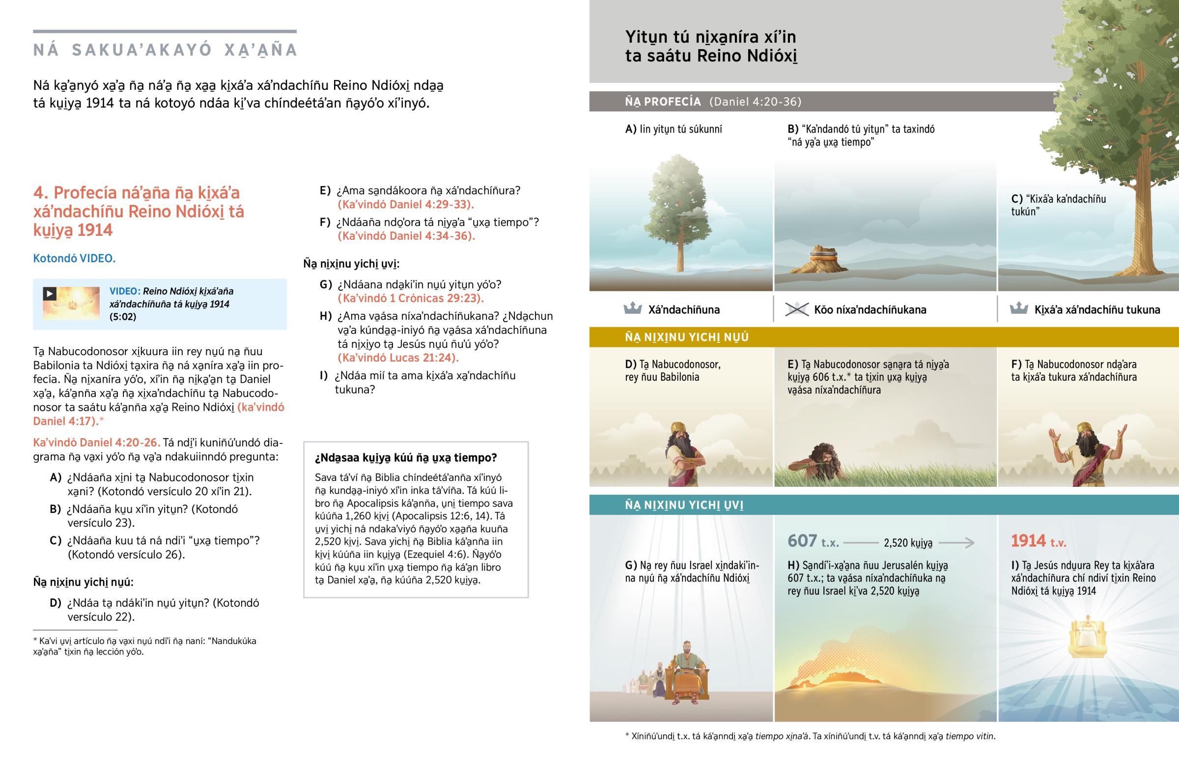 • F) ¿Ndáaña ndo̱ʼora tá ni̱ya̱ʼa “u̱xa̱ tiempo”? (Kaʼvindó Daniel 4:​34-​36).