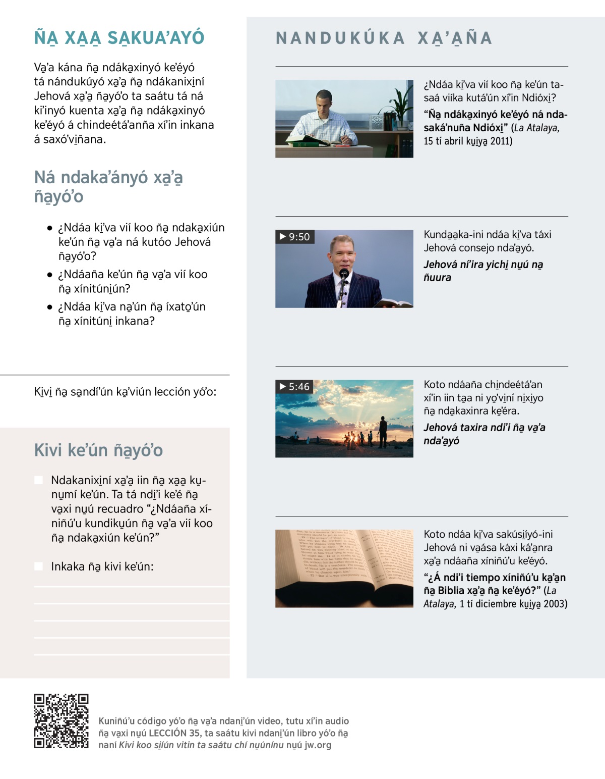 “Ña̱ ndáka̱xinyó keʼéyó ná ndasakáʼnuña Ndióxi̱” (La Atalaya, 15 tí abril ku̱i̱ya̱ 2011)