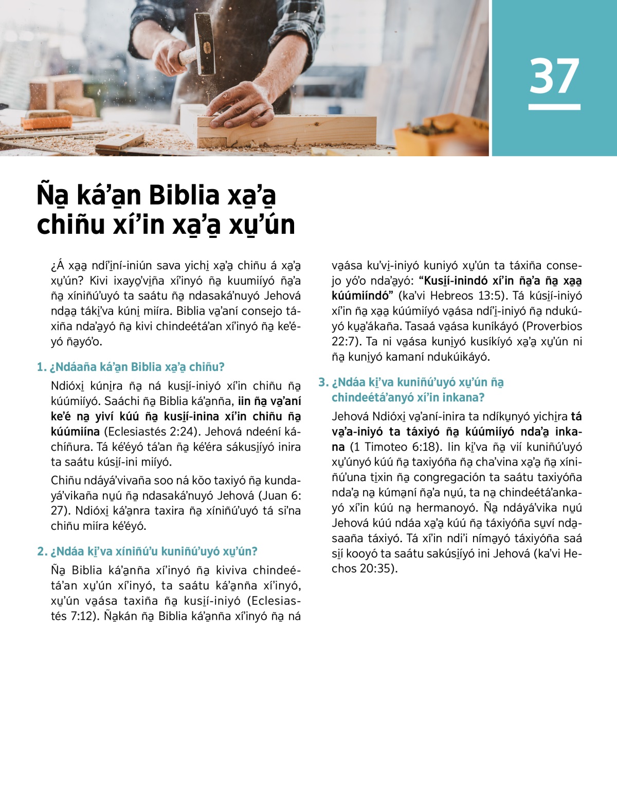 Ndióxi̱ kúni̱ra ña̱ ná kusi̱í-iniyó xíʼin chiñu ña̱ kúúmiíyó. Saáchi ña̱ Biblia káʼa̱nña, iin ña̱ va̱ʼaní keʼé na̱ yiví kúú ña̱ kusi̱í-inina xíʼin chiñu ña̱ kúúmiína (Eclesiastés 2:24). Jehová ndeéní káchíñura. Tá kéʼéyó táʼan ña̱ kéʼéra sákusi̱íyó inira ta saátu kúsi̱í-ini miíyó.