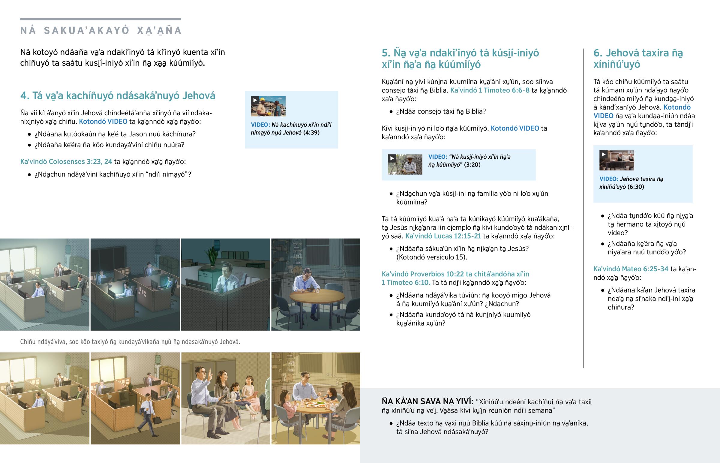 ÑA̱ KÁʼA̱N SAVA NA̱ YIVÍ: “Xíniñúʼu ndeéní kachíñui̱ ña̱ va̱ʼa taxii̱ ña̱ xíniñúʼu na̱ veʼi̱. Va̱ása kívi ku̱ʼi̱n reunión ndiʼi semana”