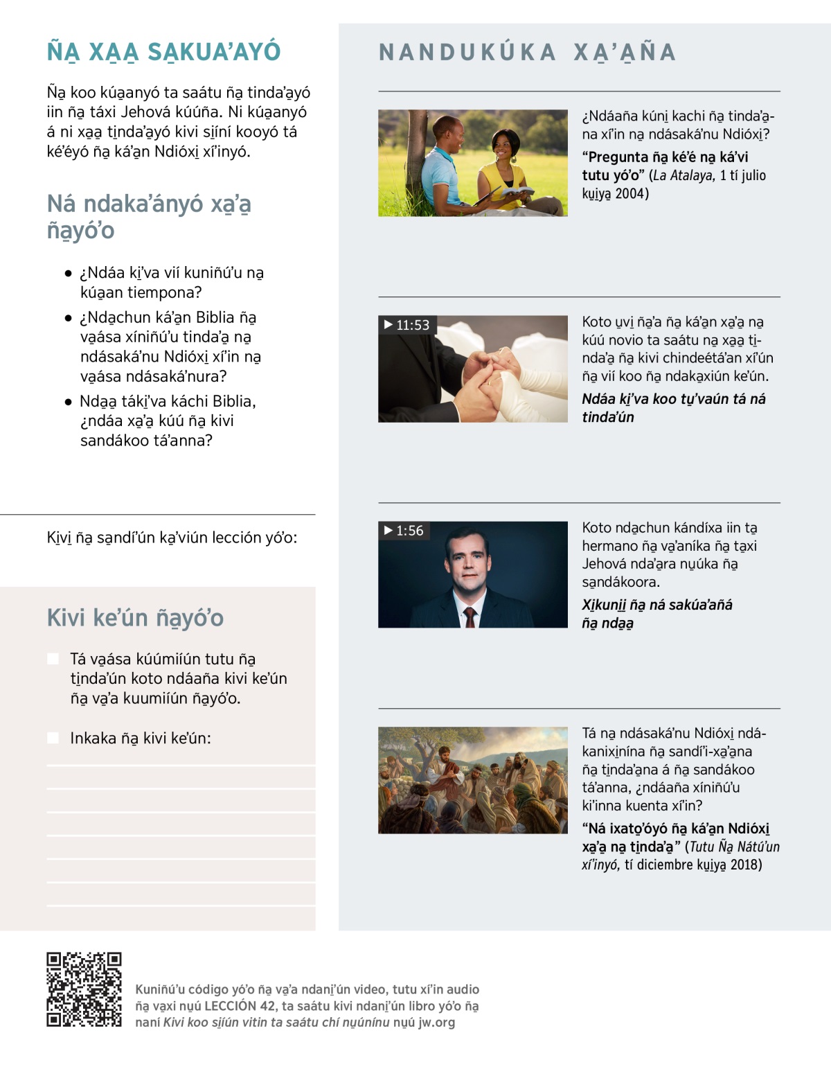 “Pregunta ña̱ kéʼé na̱ káʼvi tutu yóʼo” (La Atalaya, 1 tí julio ku̱i̱ya̱ 2004)