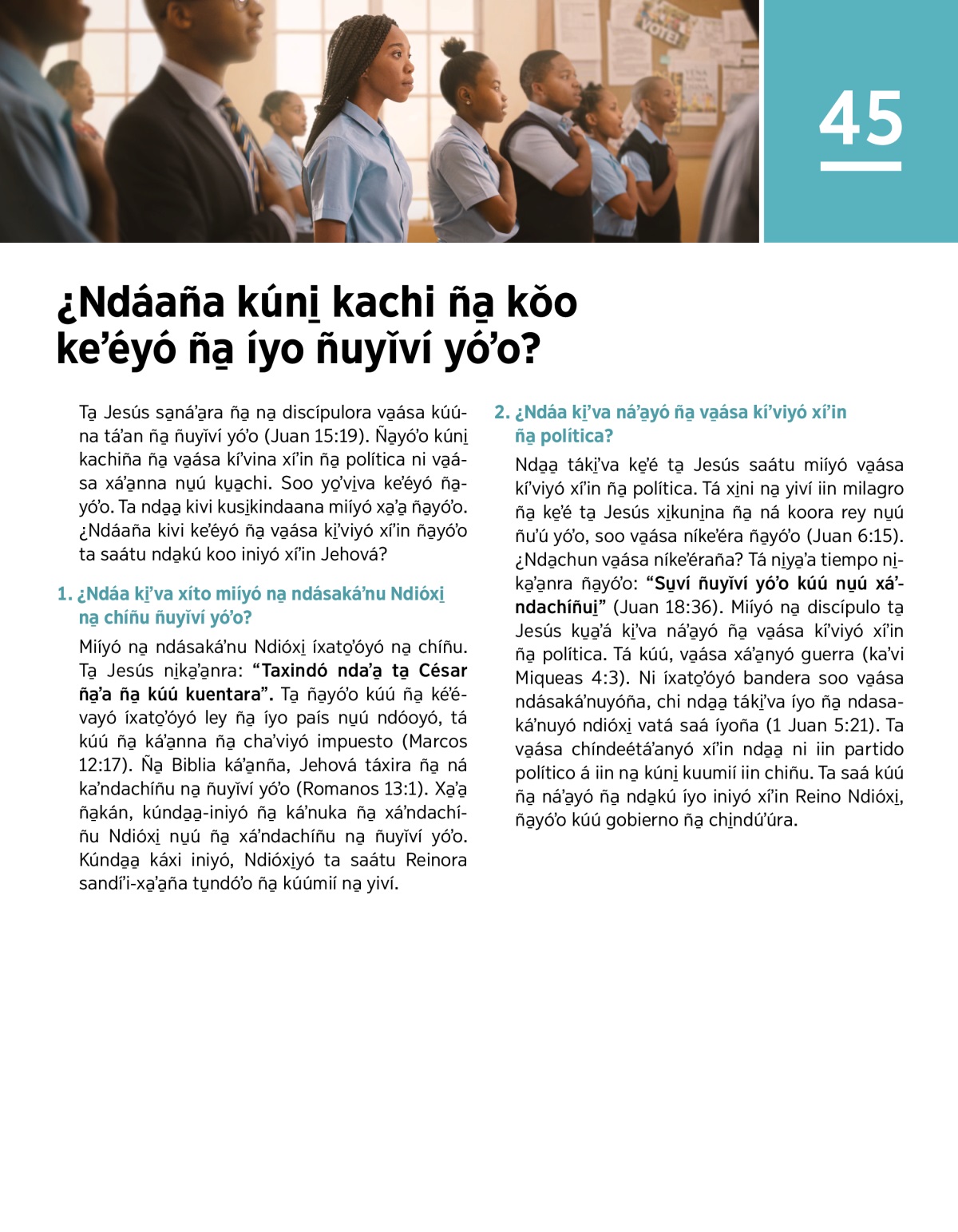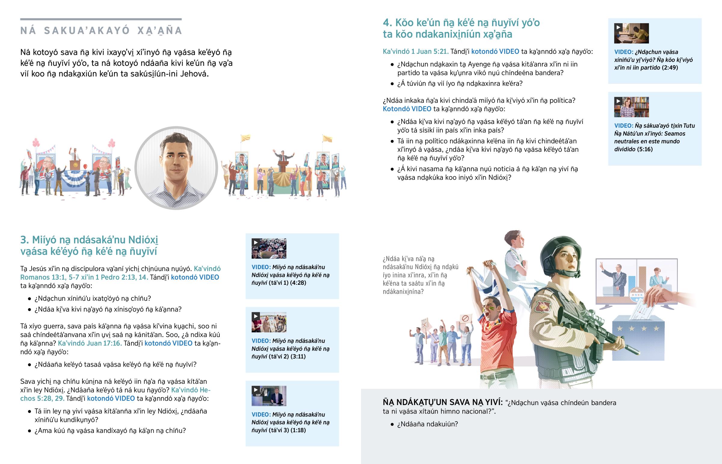 Nda̱a̱ táki̱ʼva ke̱ʼé ta̱ Jesús saátu miíyó va̱ása kíʼviyó xíʼin ña̱ política. Tá xi̱ni na̱ yiví iin milagro ña̱ ke̱ʼé ta̱ Jesús xi̱kuni̱na ña̱ ná koora rey nu̱ú ñuʼú yóʼo, soo va̱ása níkeʼéra ña̱yóʼo (Juan 6:15). ¿Nda̱chun va̱ása níkeʼéraña? Tá ni̱ya̱ʼa tiempo ni̱ka̱ʼa̱nra ña̱yóʼo: “Su̱ví ñuyǐví yóʼo kúú nu̱ú xáʼndachíñui̱” (Juan 18:36). Miíyó na̱ discípulo ta̱ Jesús ku̱a̱ʼá ki̱ʼva náʼa̱yó ña̱ va̱ása kíʼviyó xíʼin ña̱ política. Tá kúú, va̱ása xáʼa̱nyó guerra (kaʼvi Miqueas 4:3). Ni íxato̱ʼóyó bandera soo va̱ása ndásakáʼnuyóña, chi nda̱a̱ táki̱ʼva íyo ña̱ ndasakáʼnuyó ndióxi̱ vatá saá íyoña (1 Juan 5:21). Ta va̱ása chíndeétáʼanyó xíʼin nda̱a̱ ni iin partido político á iin na̱ kúni̱ kuumií iin chiñu. Ta saá kúú ña̱ náʼa̱yó ña̱ nda̱kú íyo iniyó xíʼin Reino Ndióxi̱, ña̱yóʼo kúú gobierno ña̱ chi̱ndúʼúra.