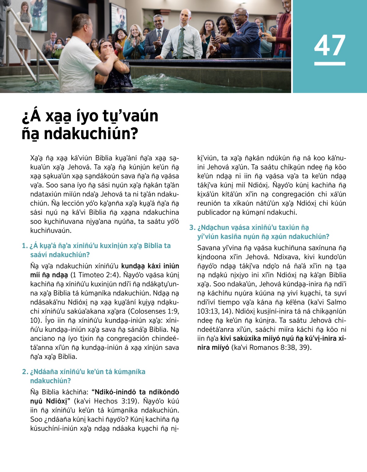 Ña̱ Biblia káchiña: “Ndikó-inindó ta ndikóndó nu̱ú Ndióxi̱” (kaʼvi Hechos 3:19). Ña̱yóʼo kúú iin ña̱ xíniñúʼu keʼún tá kúma̱níka ndakuchiún. Soo ¿ndáaña kúni̱ kachi ña̱yóʼo? Kúni̱ kachiña ña̱ kúsuchíní-iniún xa̱ʼa̱ nda̱a̱ ndáaka ku̱a̱chi ña̱ ni̱ki̱ʼviún, ta xa̱ʼa̱ ña̱kán ndúkún ña̱ ná koo káʼnu-ini Jehová xa̱ʼún. Ta saátu chíka̱ún ndee̱ ña̱ kǒo keʼún nda̱a̱ ni iin ña̱ va̱ása va̱ʼa ta keʼún nda̱a̱ táki̱ʼva kúni̱ mií Ndióxi̱. Ña̱yóʼo kúni̱ kachiña ña̱ ki̱xáʼún kítáʼún xíʼin na̱ congregación chi xáʼún reunión ta xíkaún nátúʼún xa̱ʼa̱ Ndióxi̱ chi kúún publicador na̱ kúma̱ní ndakuchi.