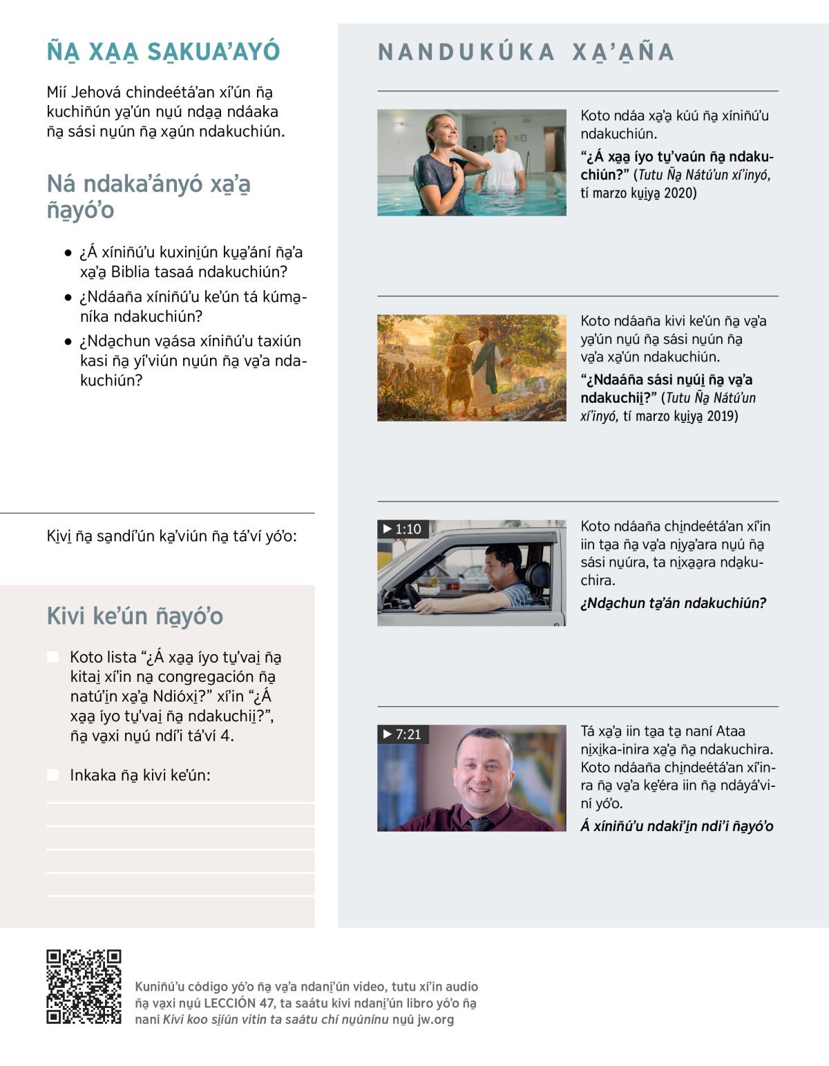 Ndiʼivayó íxayo̱ʼvi̱ña xíʼin tá ndáka̱xinyó ña̱ ndataxiyó miíyó ndaʼa̱ Jehová ta ndakuchiyó. Ña̱ va̱ʼa kunda̱a̱-iniún xa̱ʼa̱ ña̱yóʼo kotondó VIDEO. Tándi̱ʼi ka̱ʼa̱nndó xa̱ʼa̱ ña̱yóʼo: